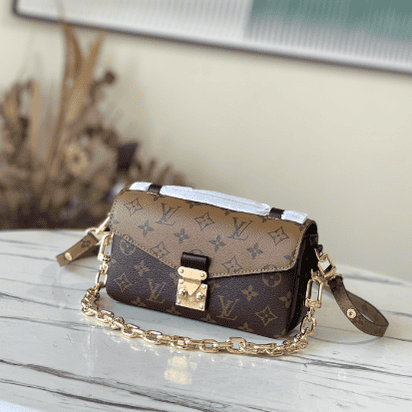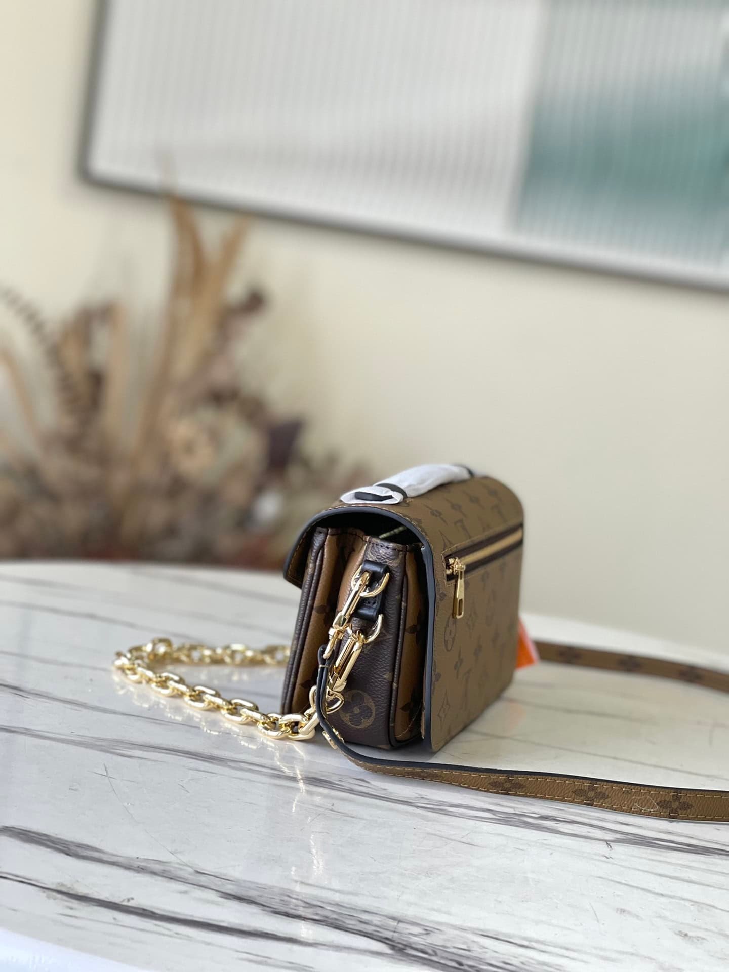 Yellow flower Pochette Métis East West handbag is made of Monogram canvas, calfskin trim and S-lock buckle. It continues the classic elements and has modern details such as a short chain on the shoulder. The roomy shape features compartments, interior zip pockets, and exterior pockets to easily store your iPhone 13.