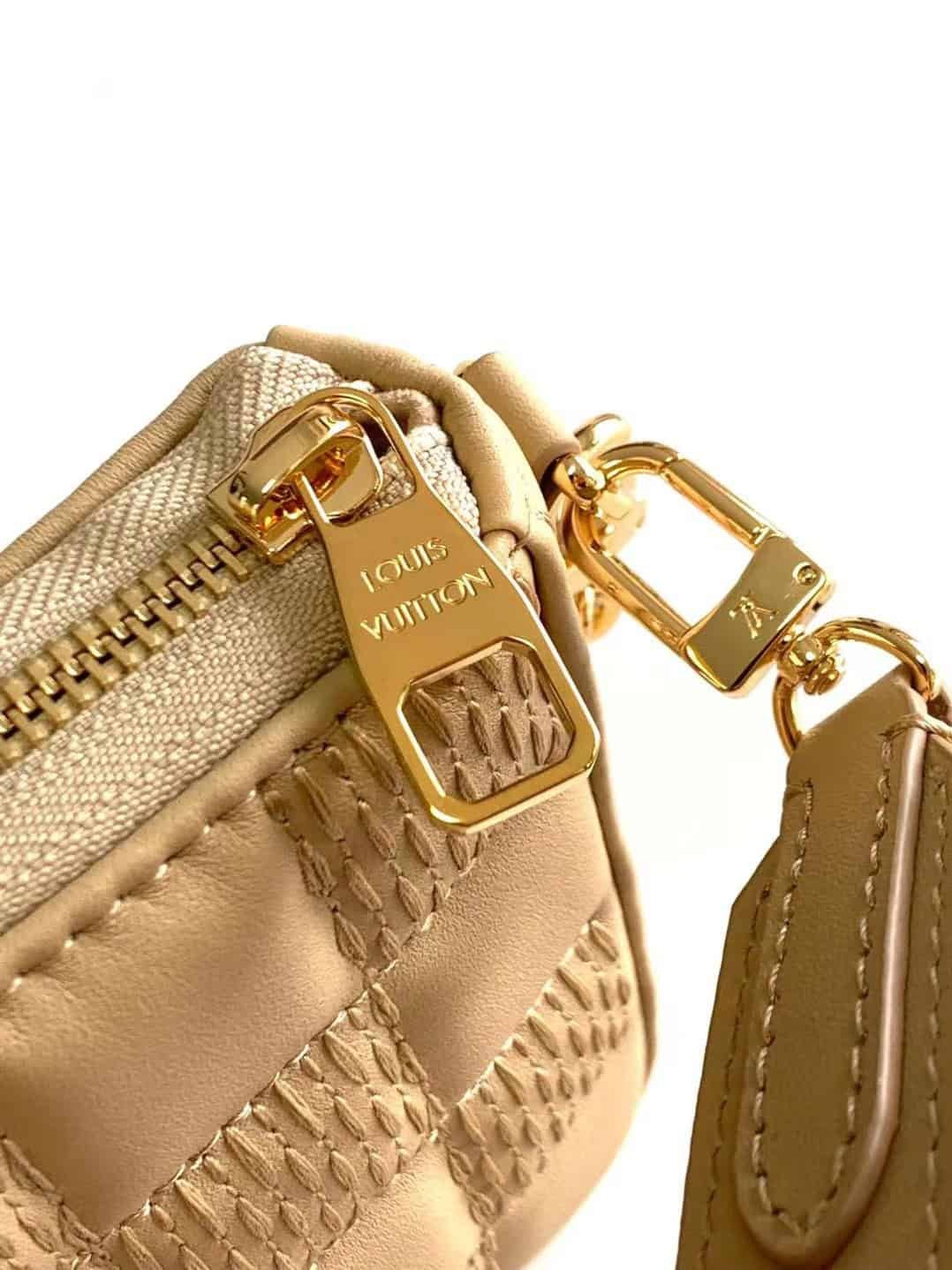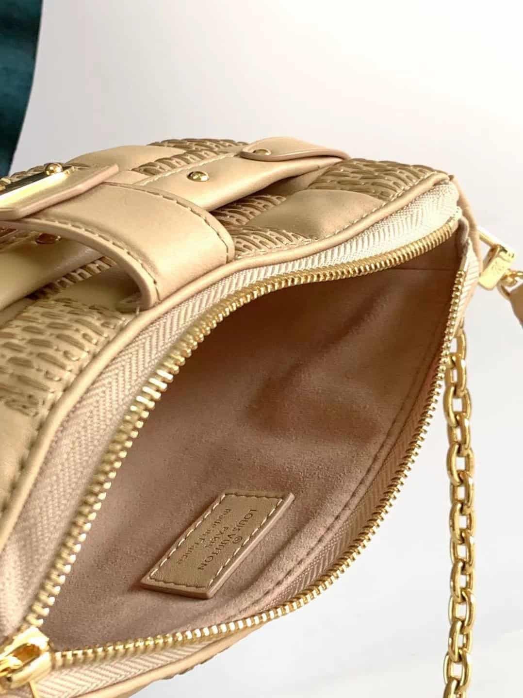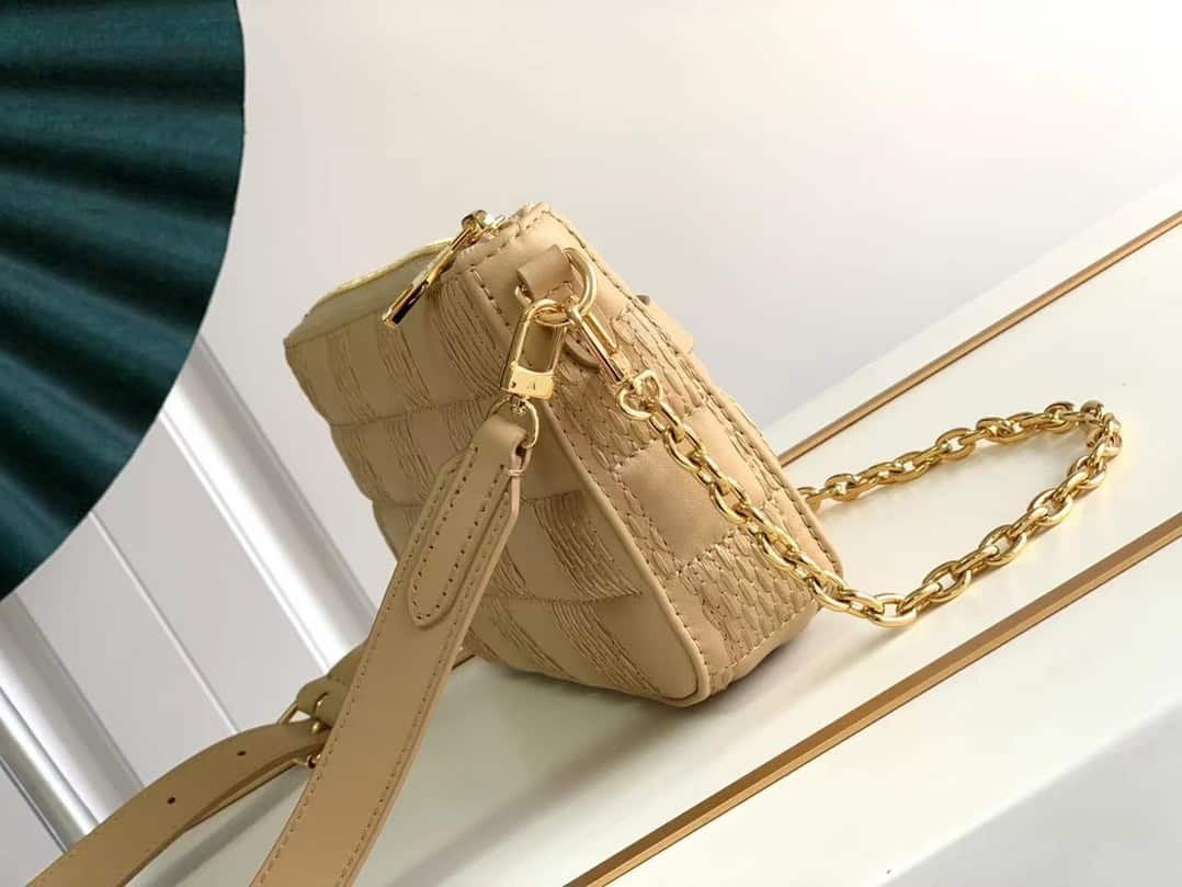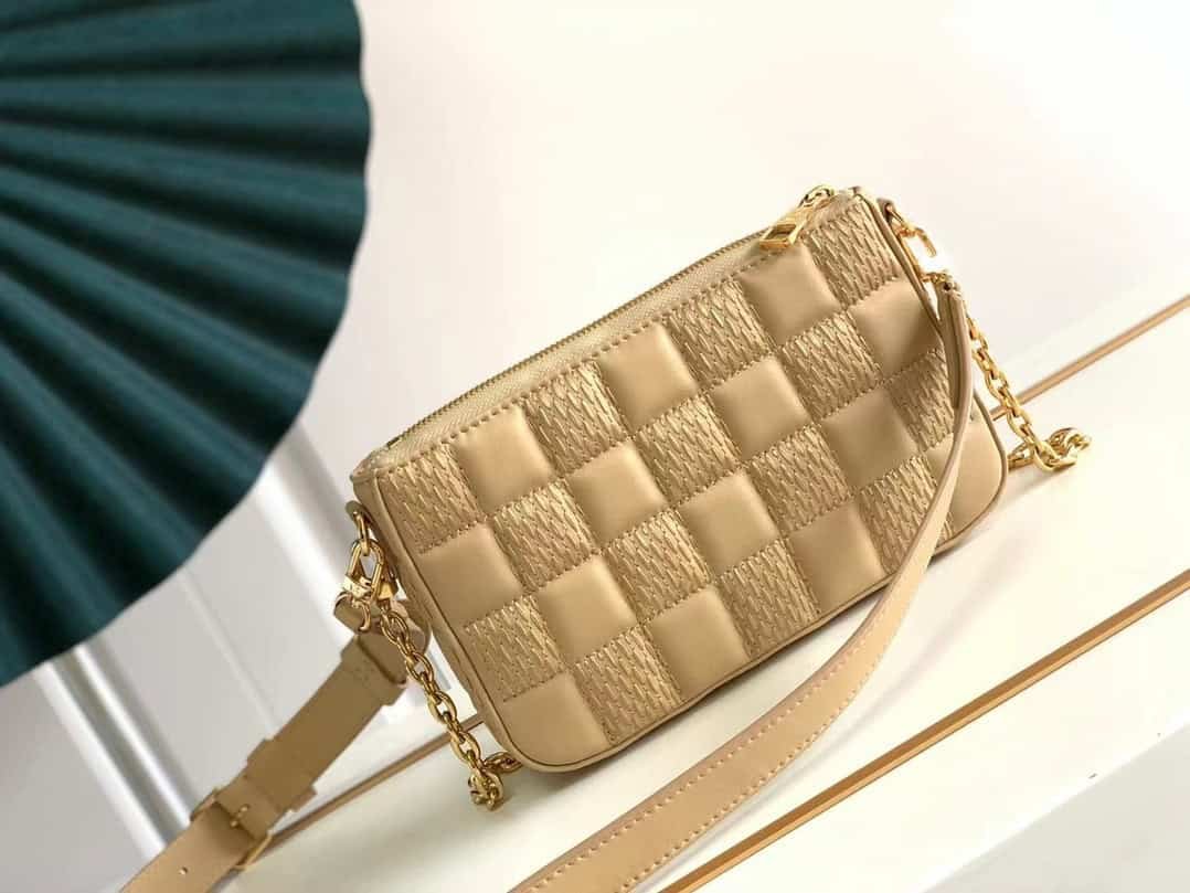 Pochette Troca handbag follows the square shape of Louis Vuitton’s classic Trocadéro camera bag, and is equipped with traditional hard box elements such as the iconic S-Lock lock. The soft quilted sheepskin is embroidered with the Damier pattern and can be worn with a chain or adjustable shoulder strap.