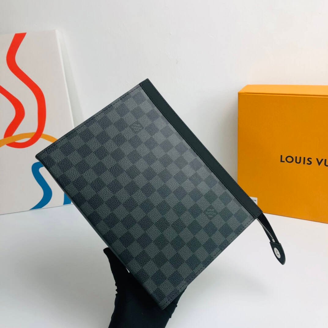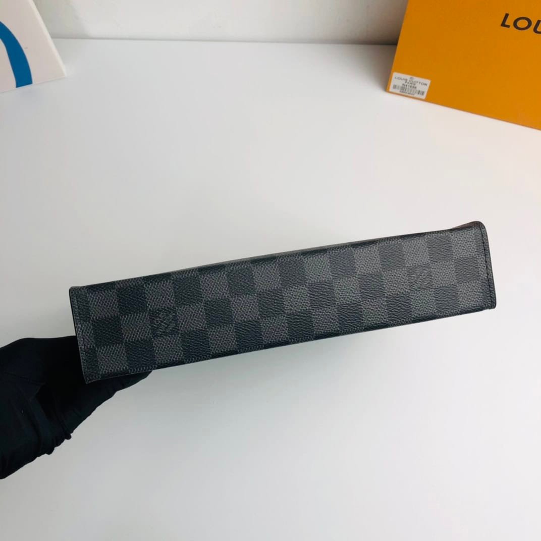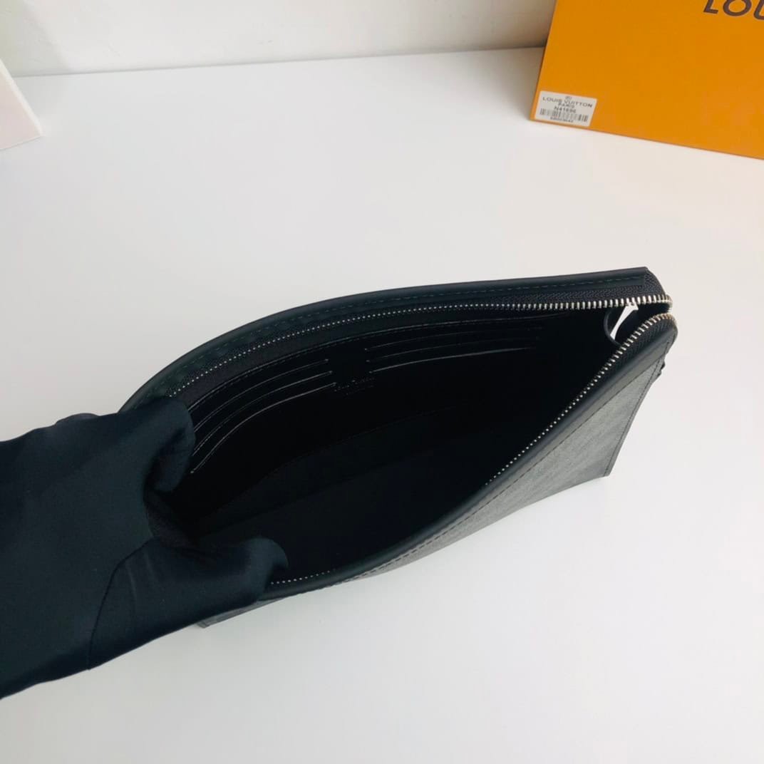 The compact and stylish Pochette Voyage Medium Clutch is versatile enough to be carried in a bag as a travel bag or held in your hand for style. Spacious interior with gussets for easy access to personal essentials, Graphite coated canvas – fabric lining – cowhide trim – silver tone hardware – zipper closure system – interior patch pocket – 6 credit cards Groove.