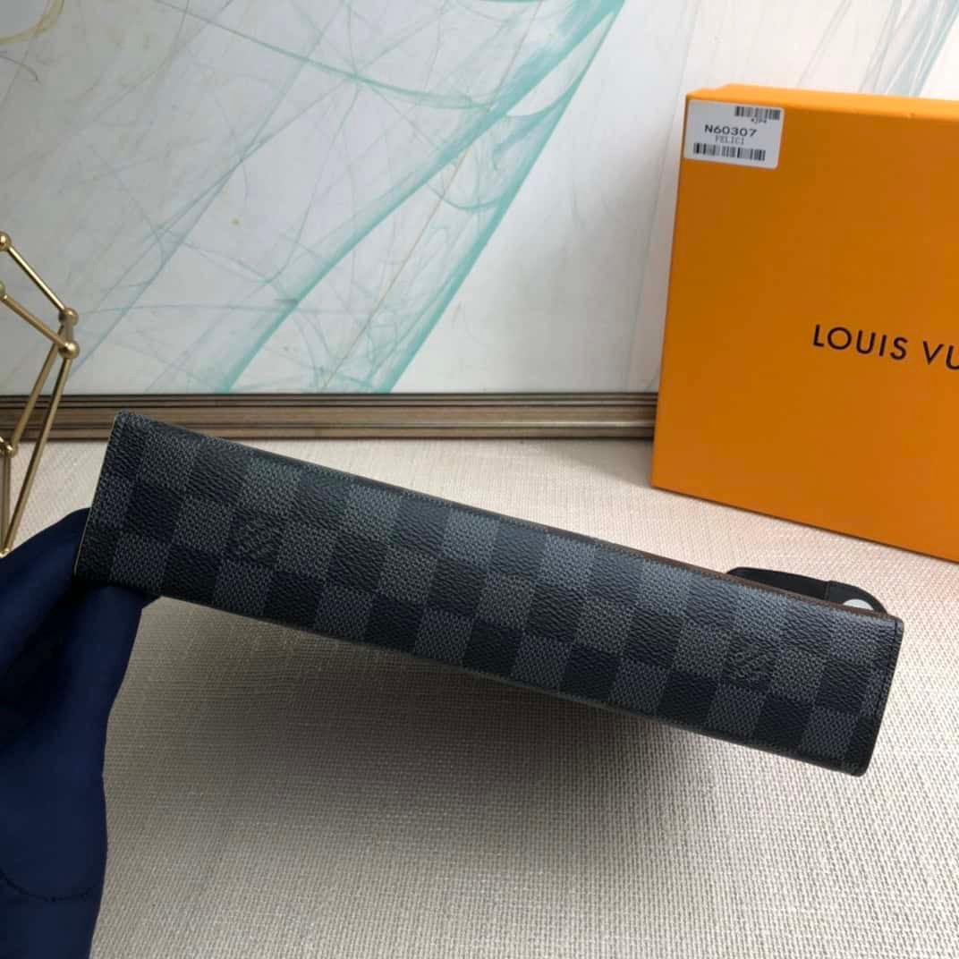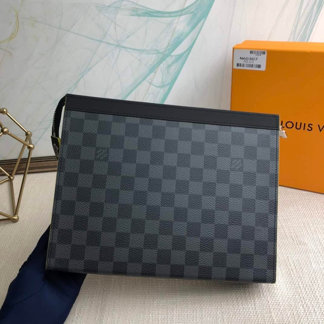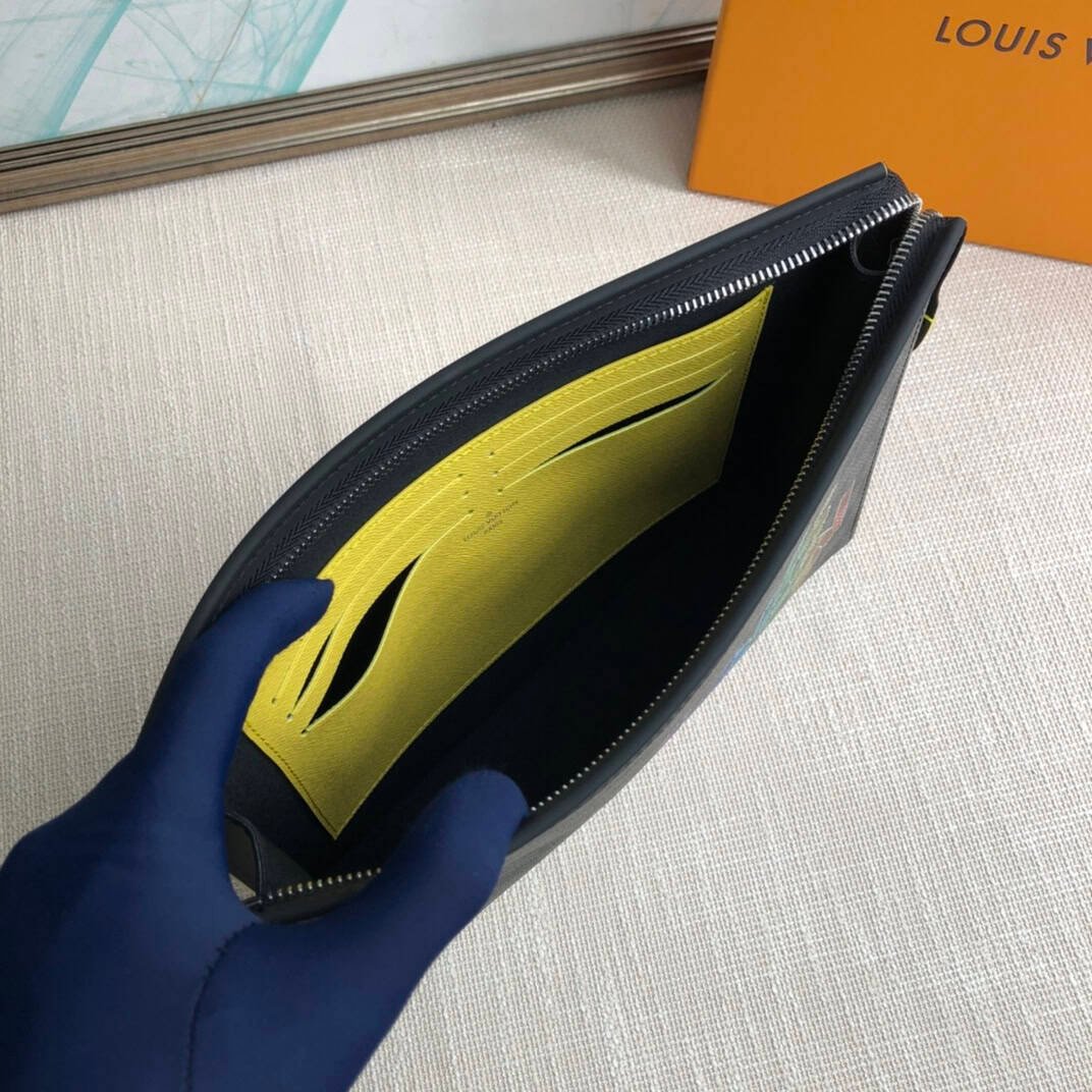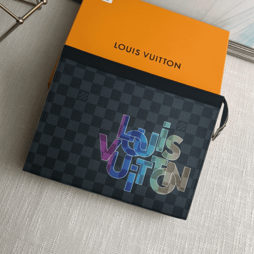 The versatile Pochette Voyage Medium in Damier Graphite canvas can be held like a small briefcase or carried as a handbag in a larger backpack. The new colorful monogrammed Louis Vuitton logo designed by Menswear Artistic Director Virgil Abloh offers stylish playfulness.
