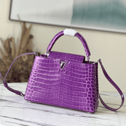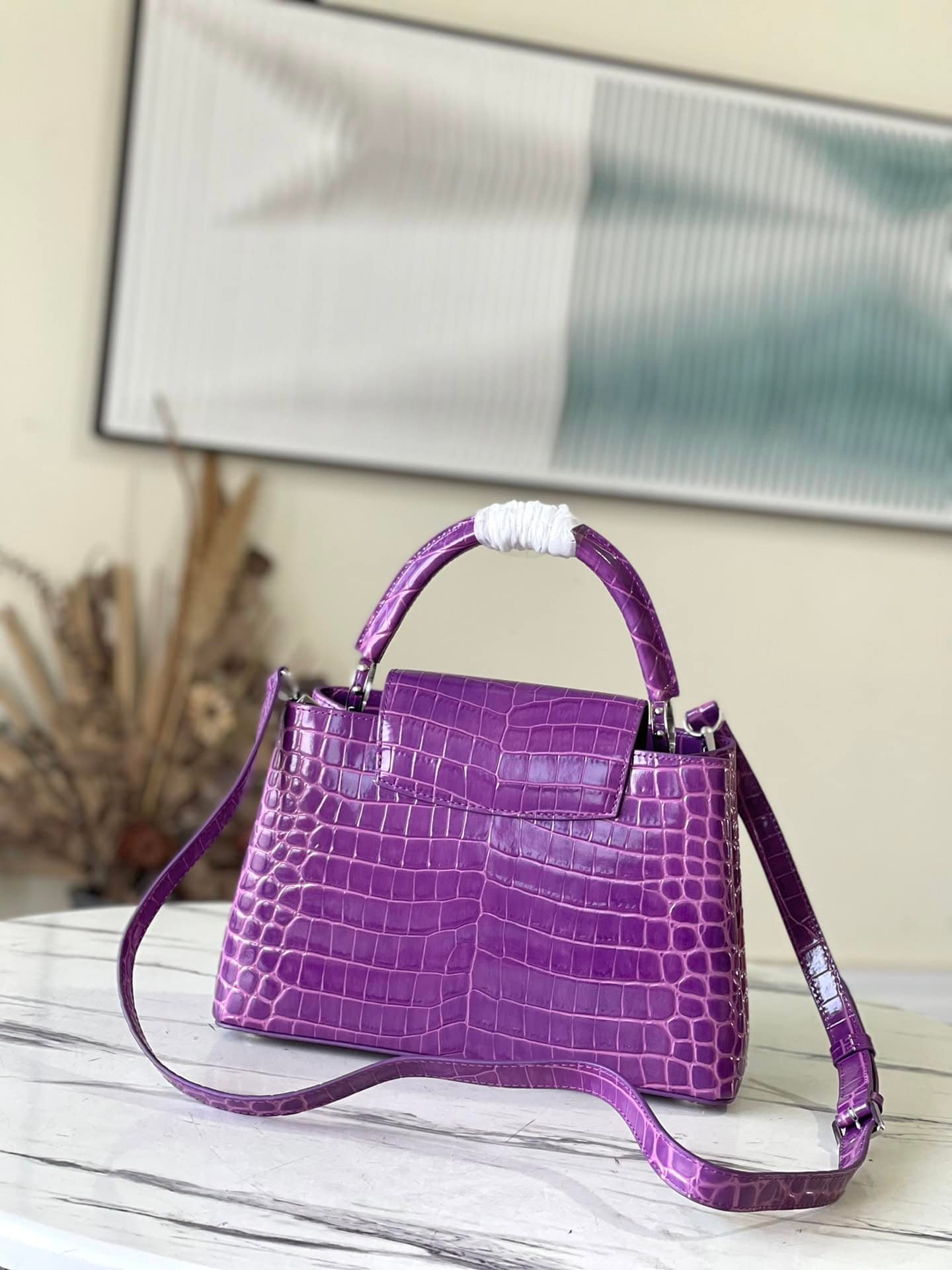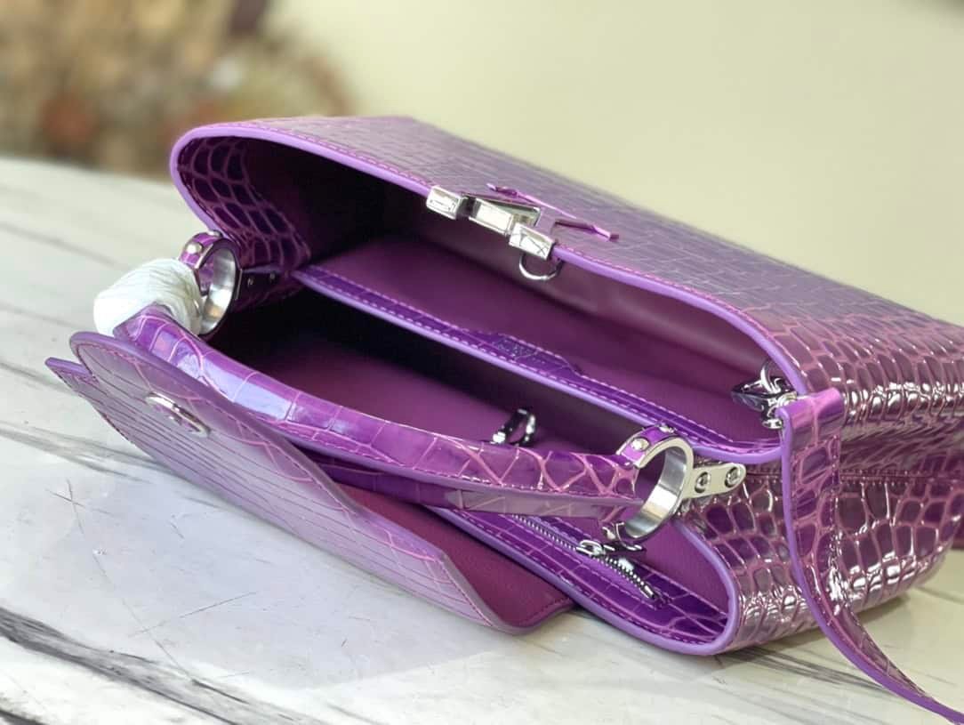 Purple crocodile pattern silver buckle This precious Capucines medium handbag is made of crocodile pattern and treated with high gloss. The income bag displays the letter logo and can be turned inside out to present the Monogram Flower pattern. The ideal accessory for night out.