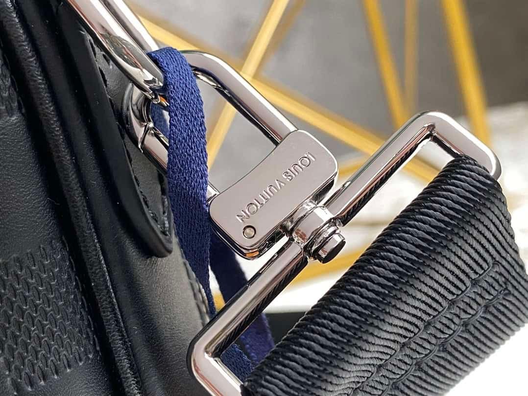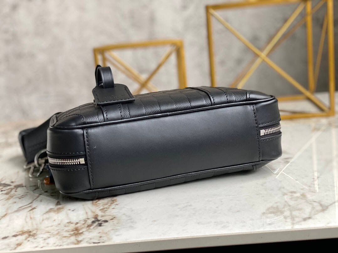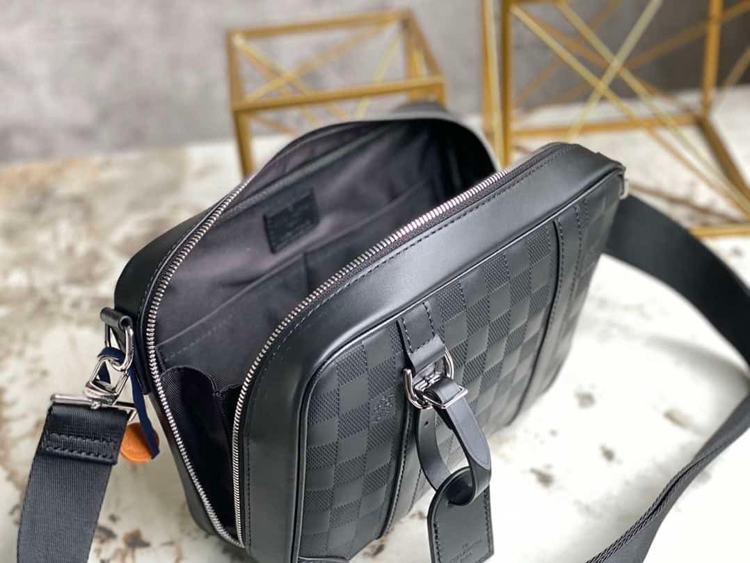 Full Leather Pressed Messenger Bag Series Sirius Messenger Bag is made of Damier Infini Onyx cowhide leather. The detachable and adjustable shoulder strap can be worn over the shoulder or cross-body, and the leather name tag attached to the D-ring adds ingenuity.