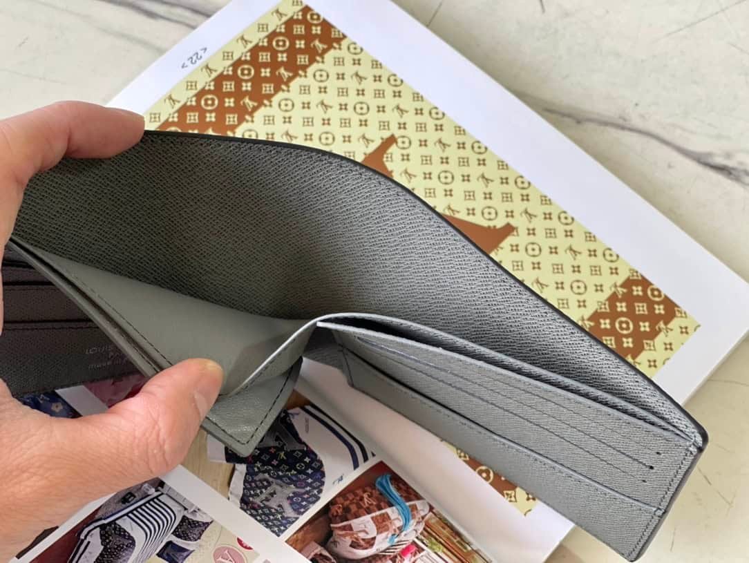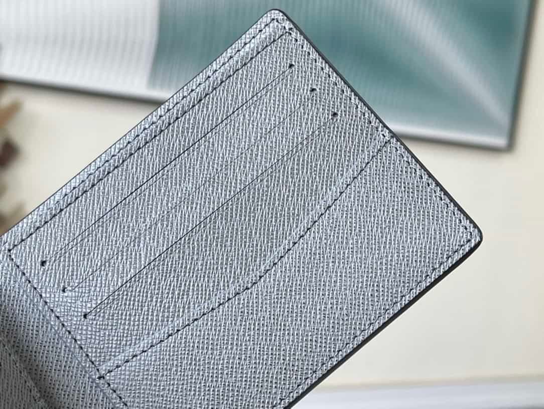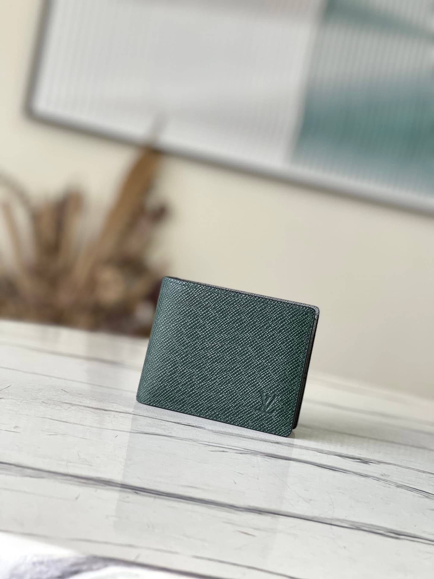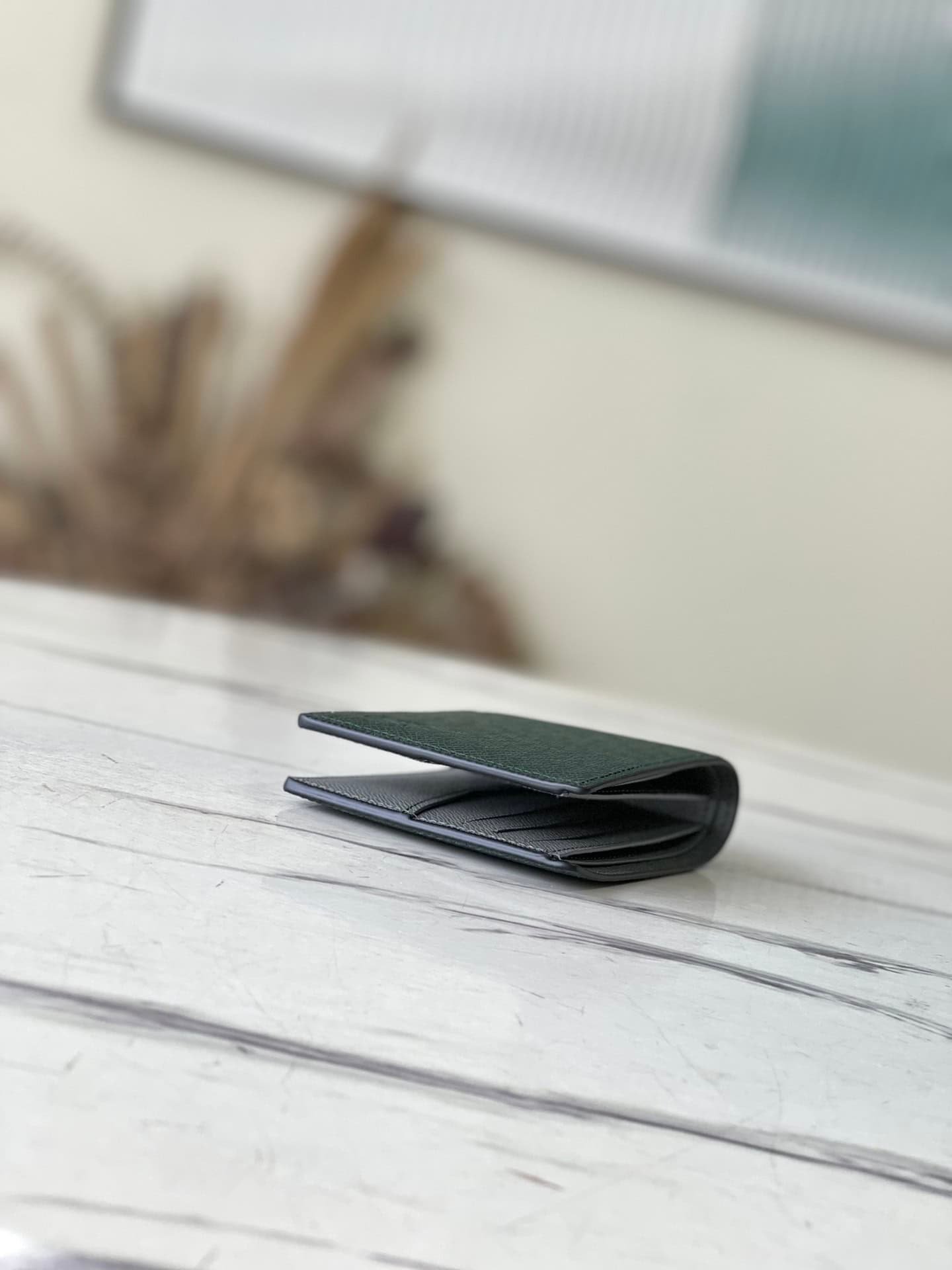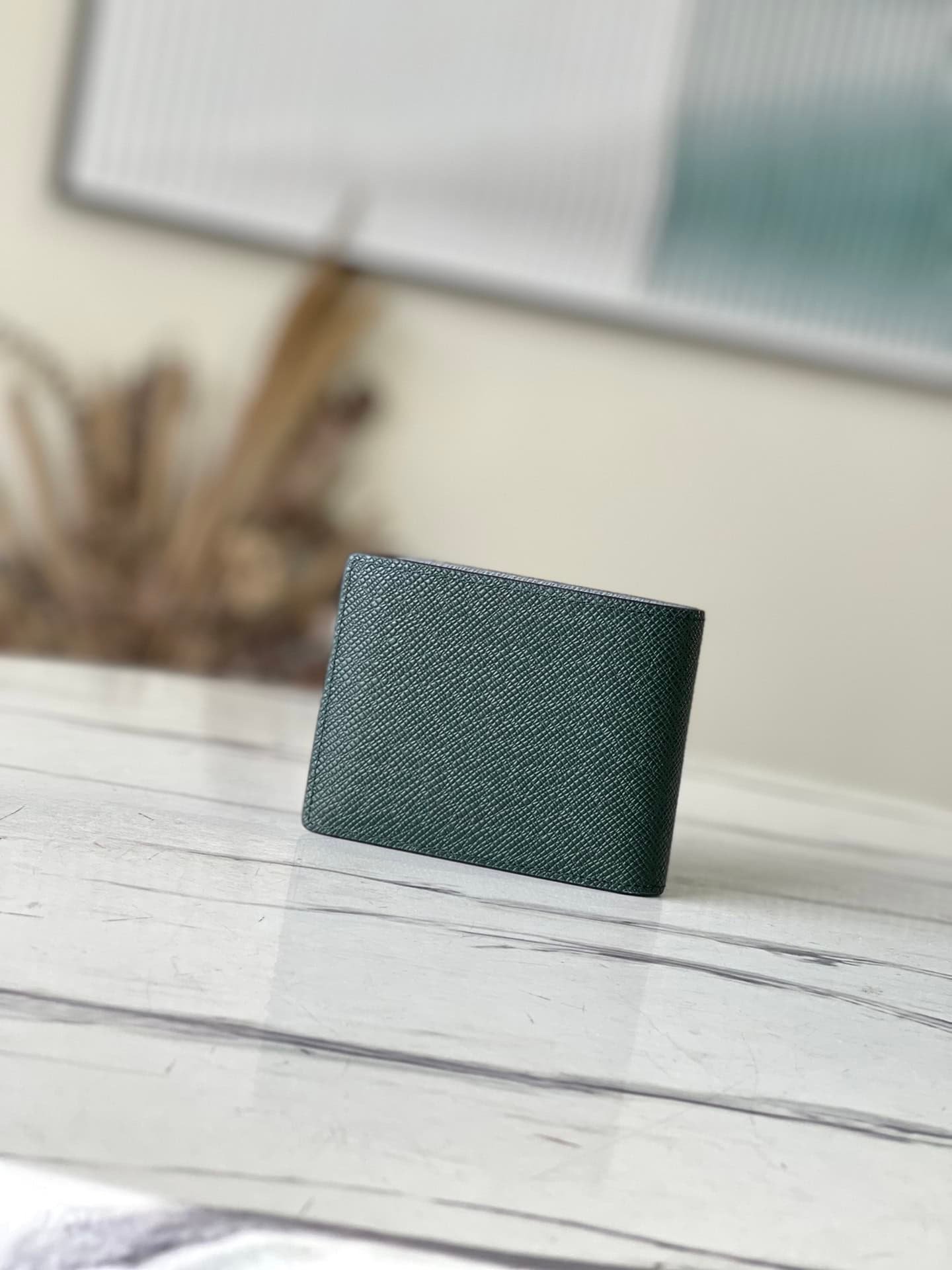 Saffiano Green This Slender Wallet features a calm tone of Taïga embossed leather and a slim profile that includes card slots and bill compartments, and fits easily in most pockets.
