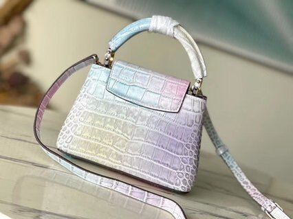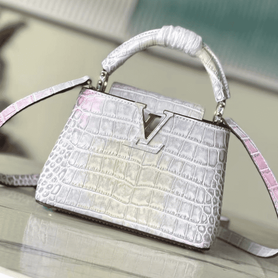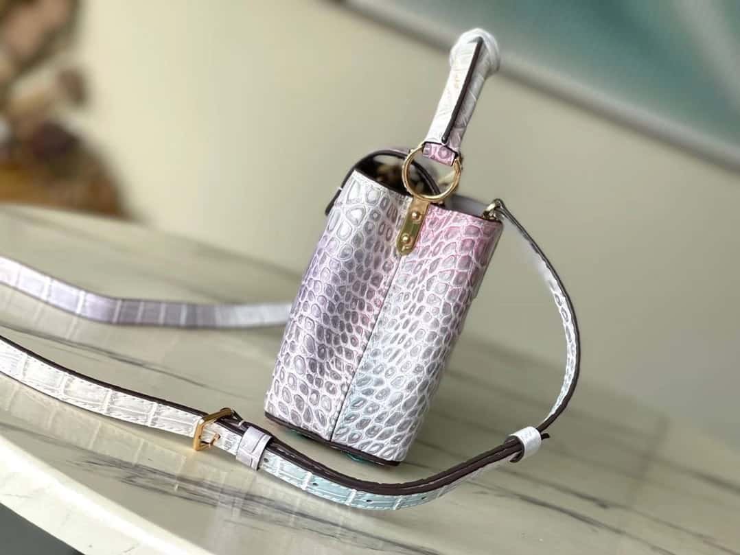 Noble crocodile skin pattern, luxurious goatskin lining, shiny metal accessories, unique Capucines cover that can be stored in the bag to display the letter logo, or can be turned out to display the Monogram Flower pattern.