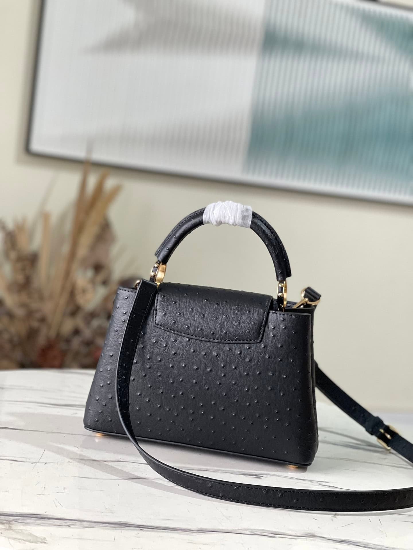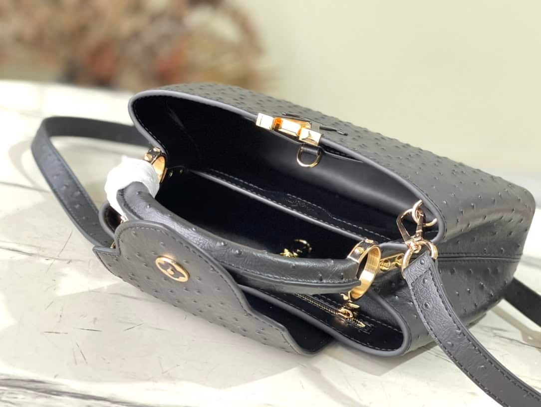 Small Capucines ostrich leather handbag in black ostrich leather, moderate hardness handle, gorgeous buckle connecting the handle, spacious and practical shape, etc. The drop cover can be used in two ways, and it can be placed outside the bag to show the fashion trend of the Monogram flower pattern.