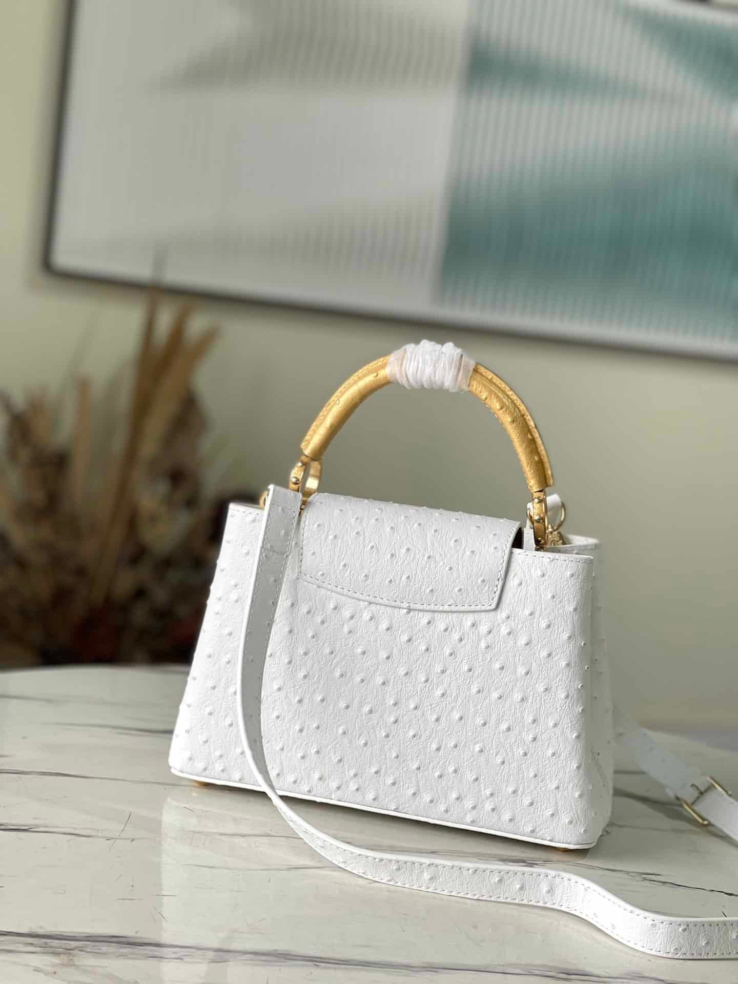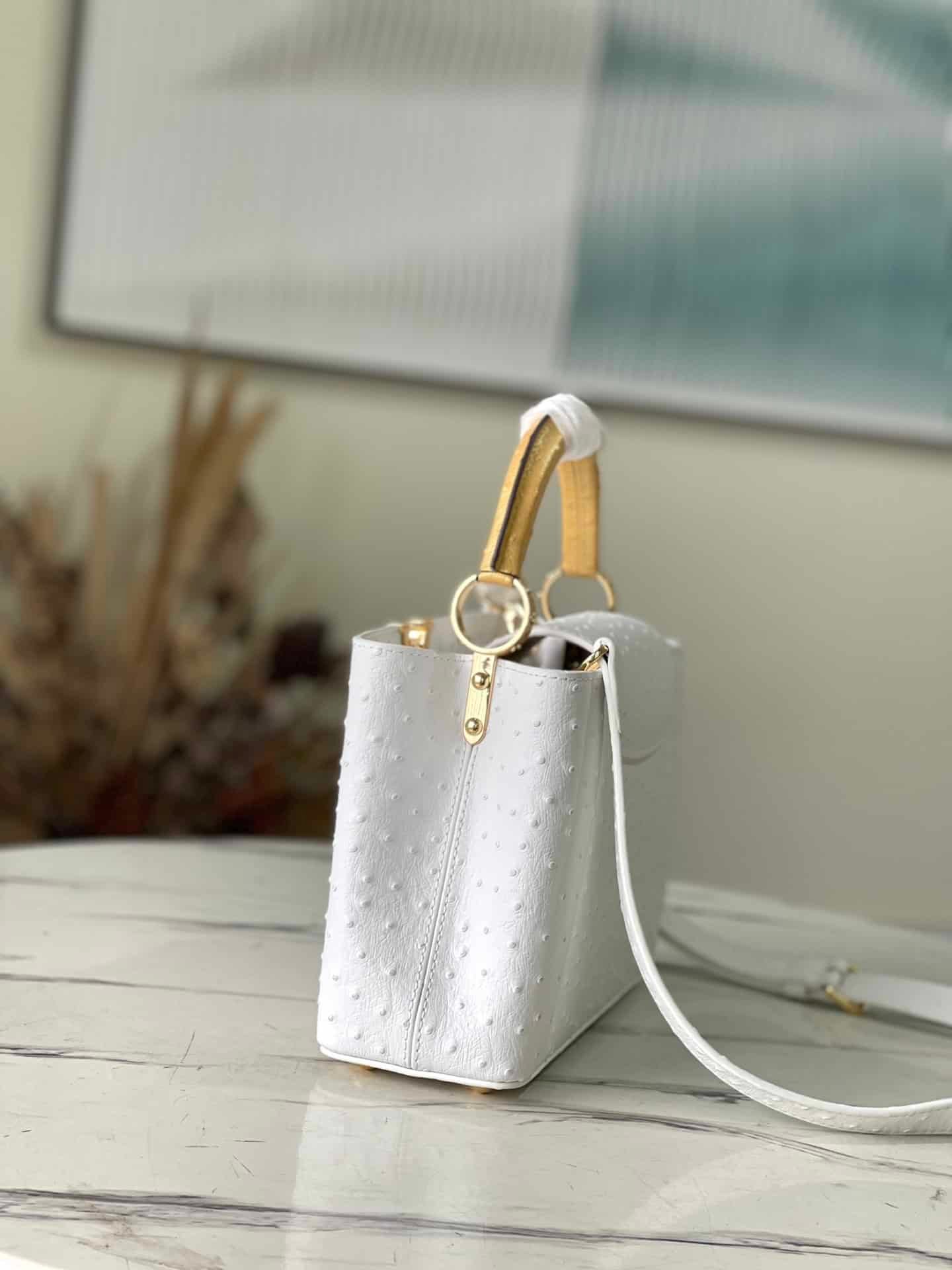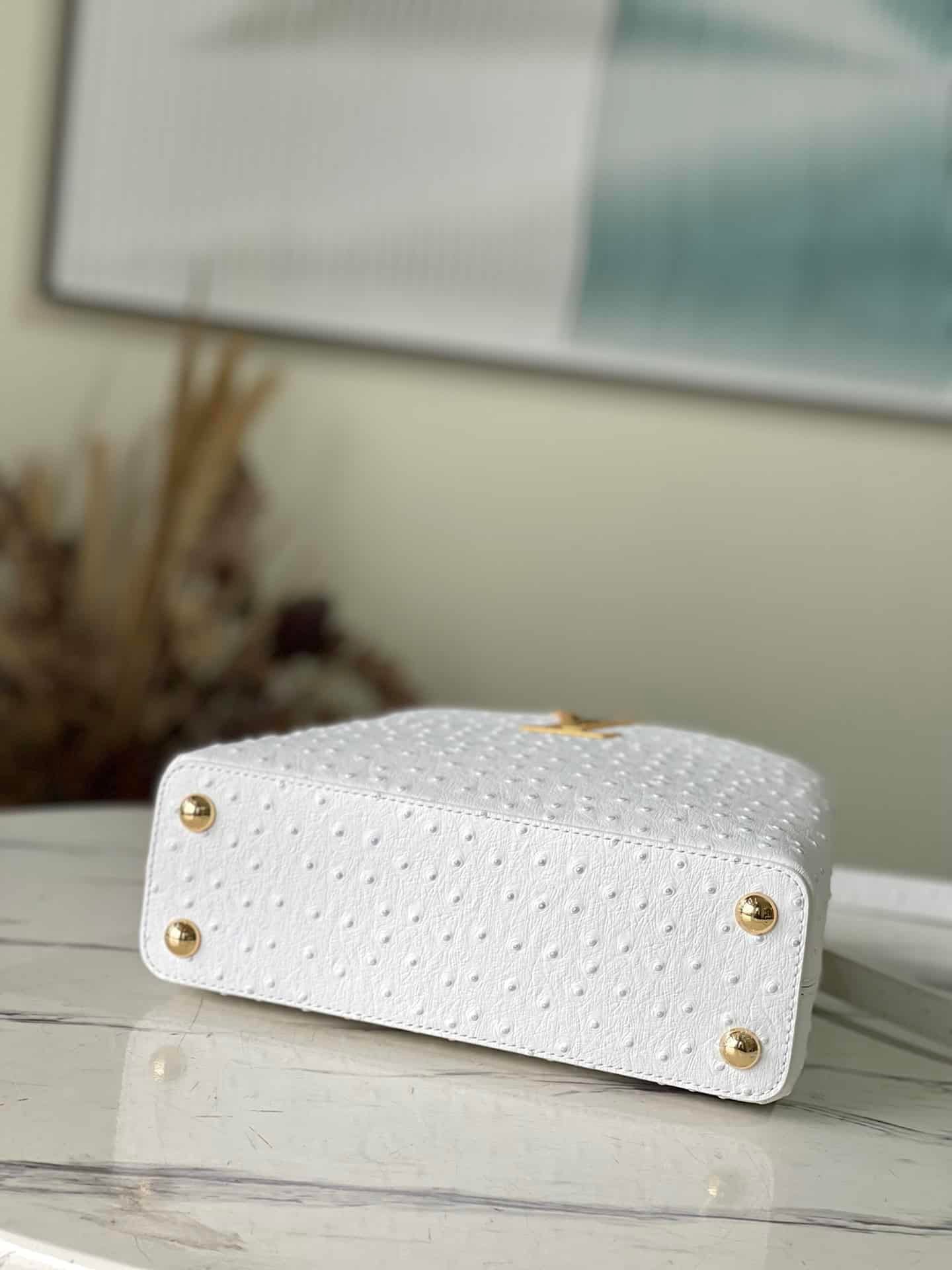 Platinum ostrich leather small Capucines ostrich leather handbag, moderate hardness handle, gorgeous buckle connecting the handle, spacious and practical shape, etc. The drop cover can be used in two ways, and it can be placed outside the bag to show the fashion trend of the Monogram flower pattern.