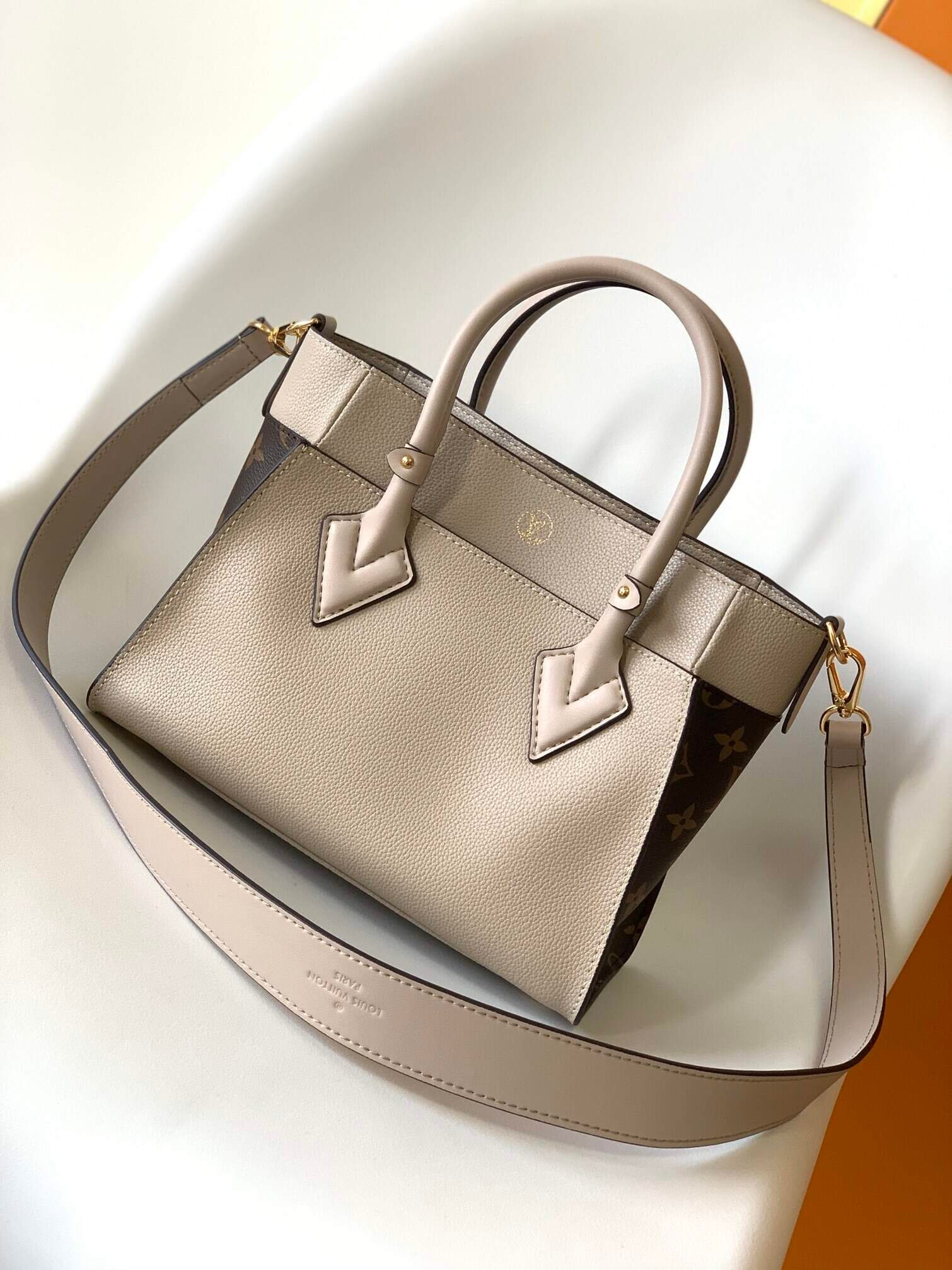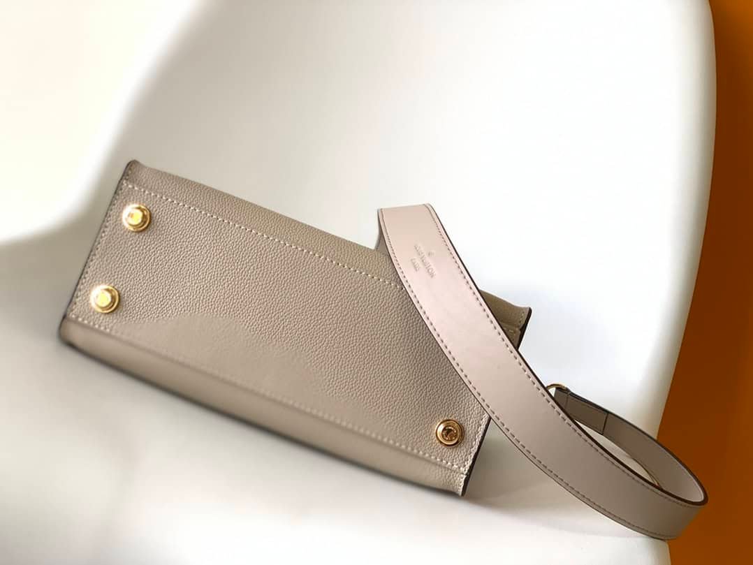 This small On My Side handbag combines soft calfskin with classic Monogram canvas side lining, with a detachable wide shoulder strap for shoulder and crossbody experience, top handle Add the option of carrying it by hand or by the elbow. Large outer pocket for easy access to items.