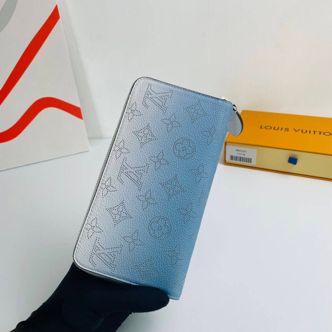 This Zippy wallet, made of soft Mahina leather with monochromatic pattern penetration and subtle color gradation, has a contrasting leather lining and silver hardware to enhance the design, with Monogram perforation design. Also attractive is the easy-to-organize interior with multiple pockets and card slots. Dimensions: 19.5 x 10.5 x 2.5 cm