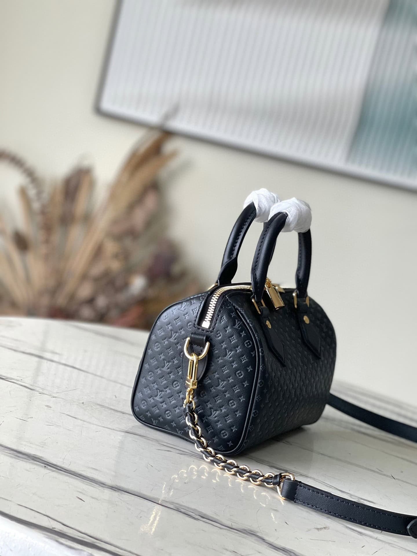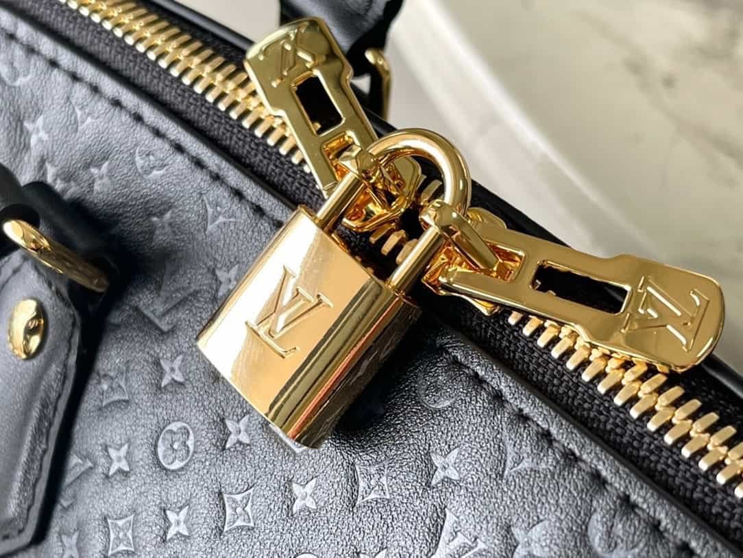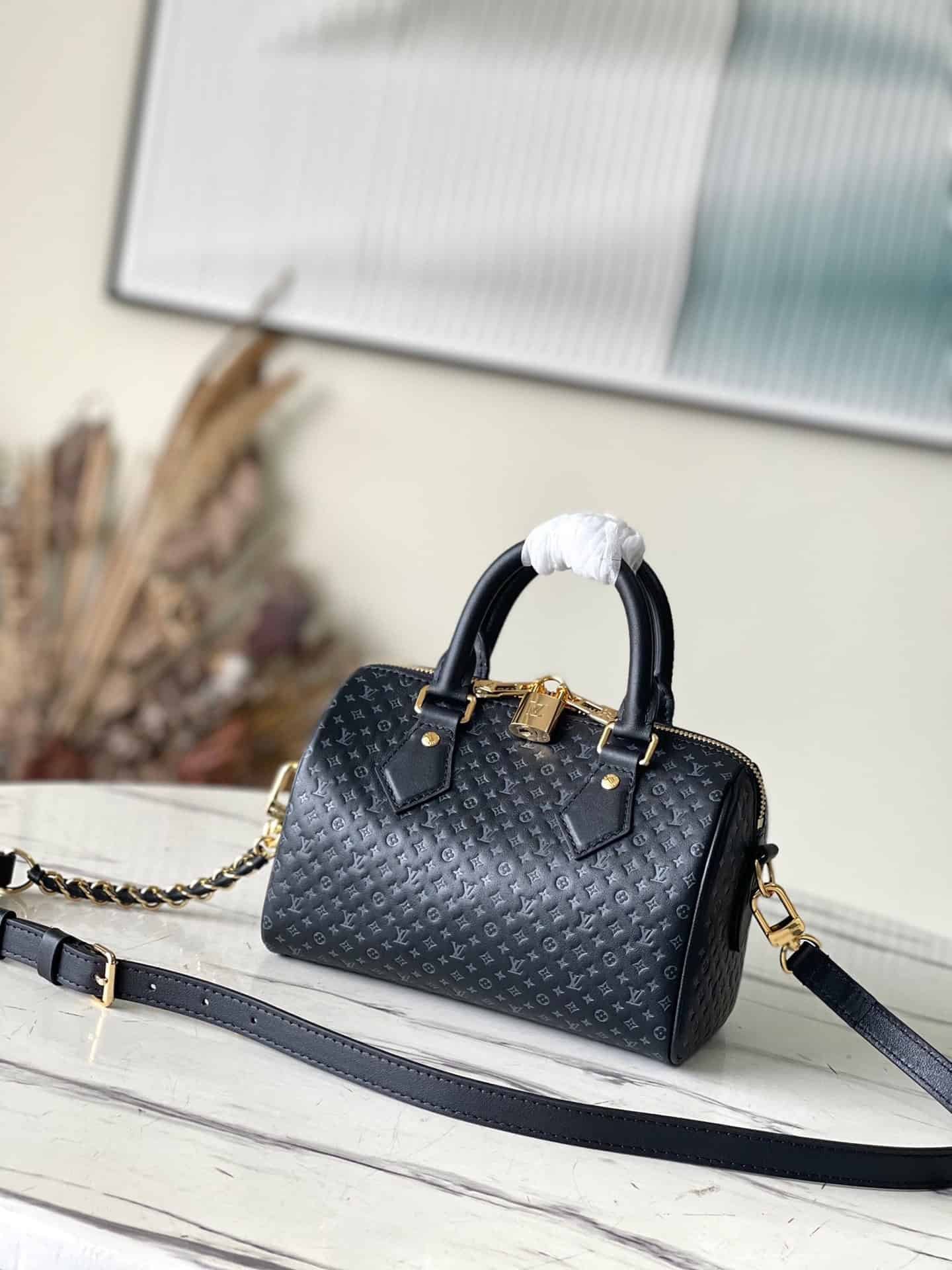 Black Speedy 20 handbag from Nanogram Special Collection, calfskin material, printed with mini Monogram pattern. Recognizable for its chic silhouette and engraved padlock, it comes with a detachable and adjustable braided leather chain strap for easy shoulder or cross-body carry.