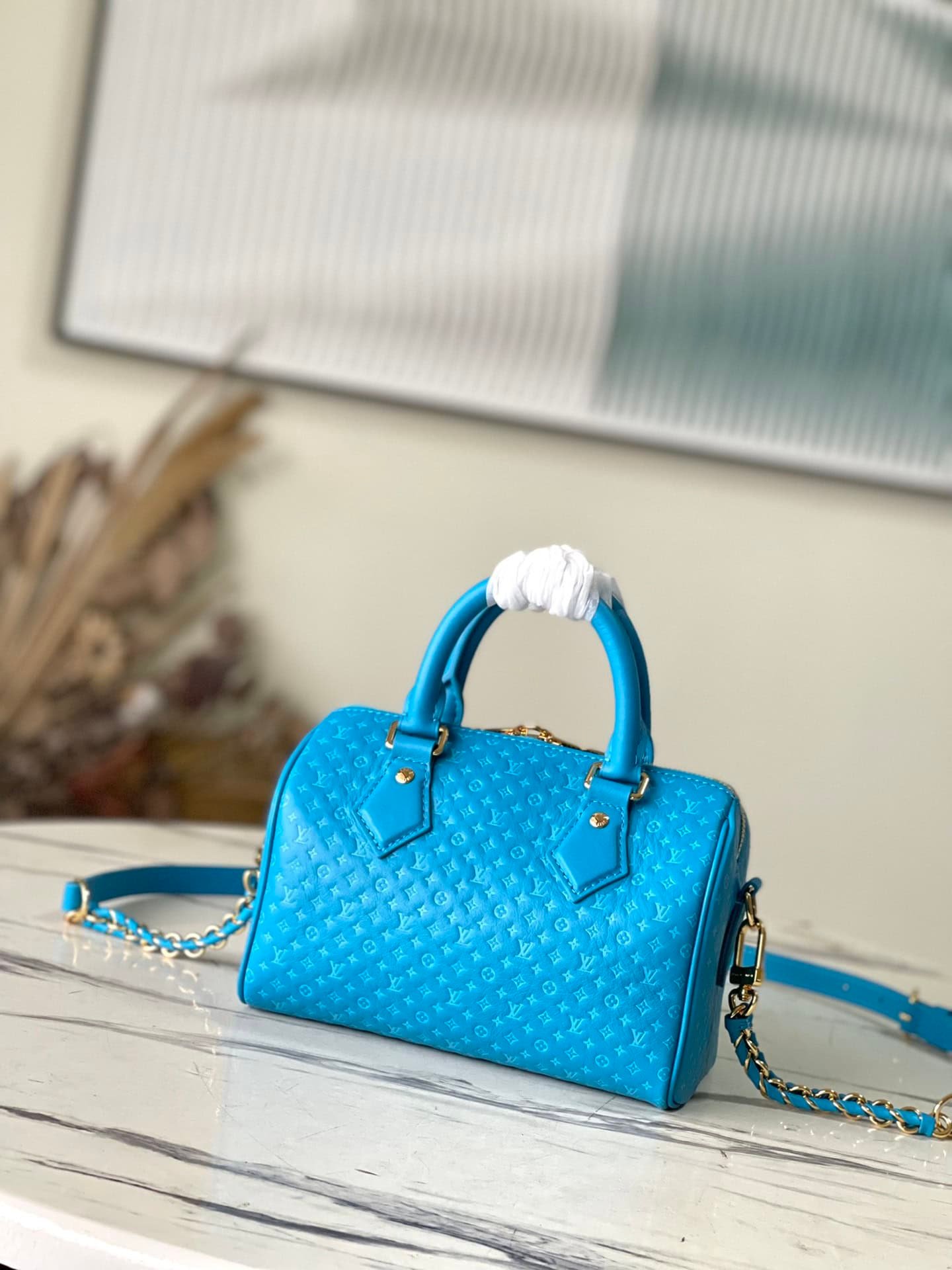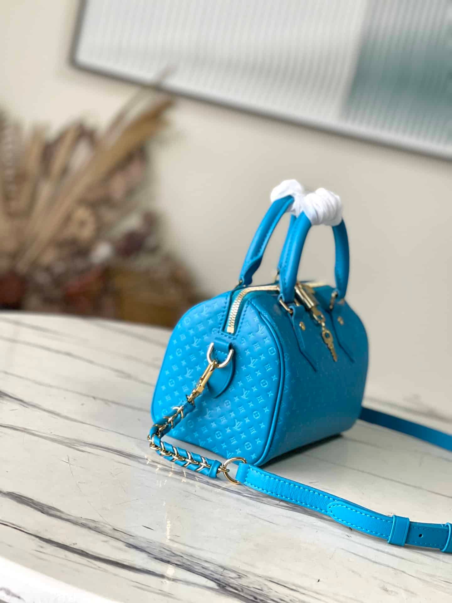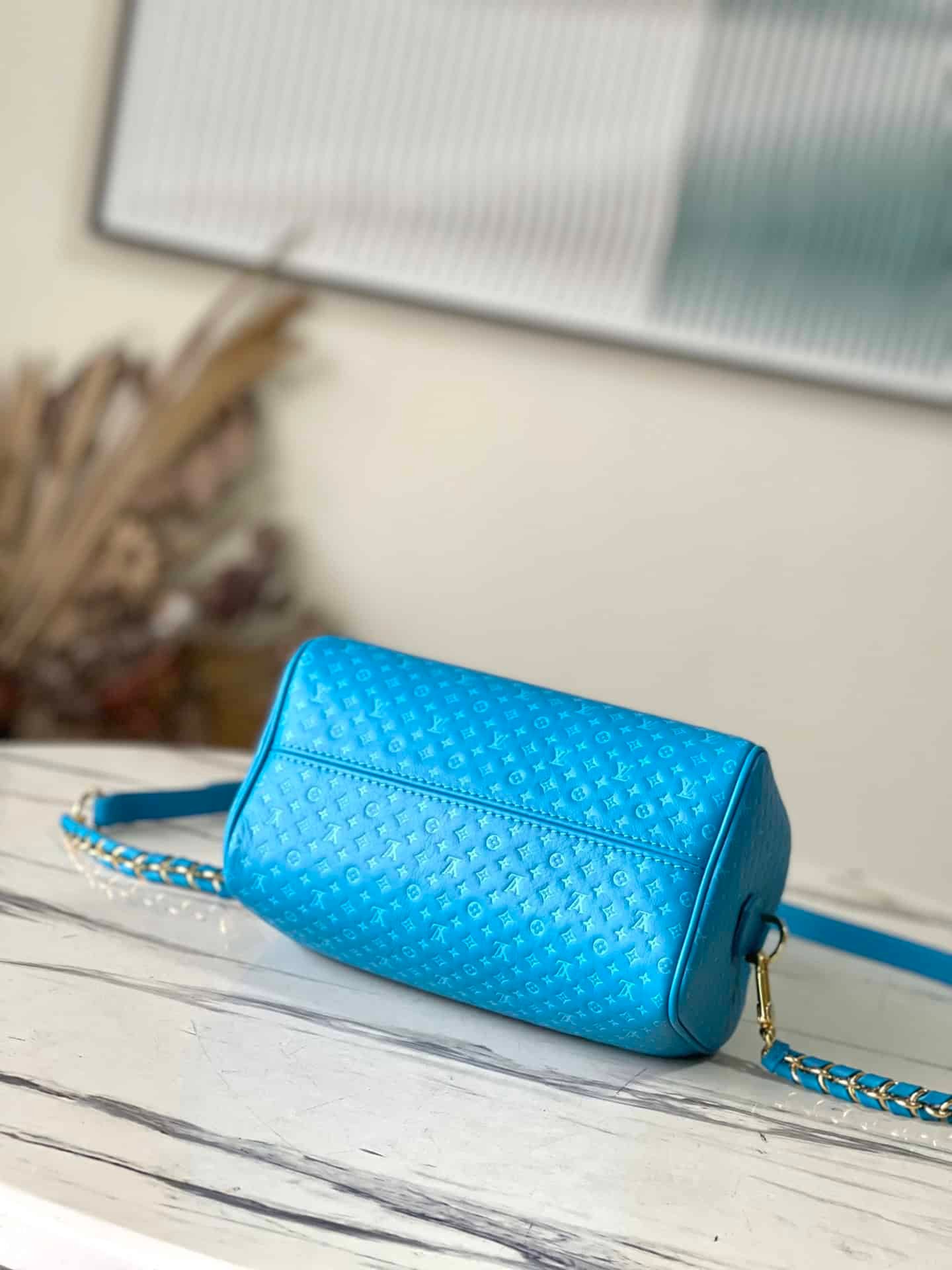 Blue Speedy 20 Handbag from Nanogram Special Collection, calfskin material, printed with mini Monogram pattern. Recognizable for its chic silhouette and engraved padlock, it comes with a detachable and adjustable braided leather chain strap for easy shoulder or cross-body carry.
