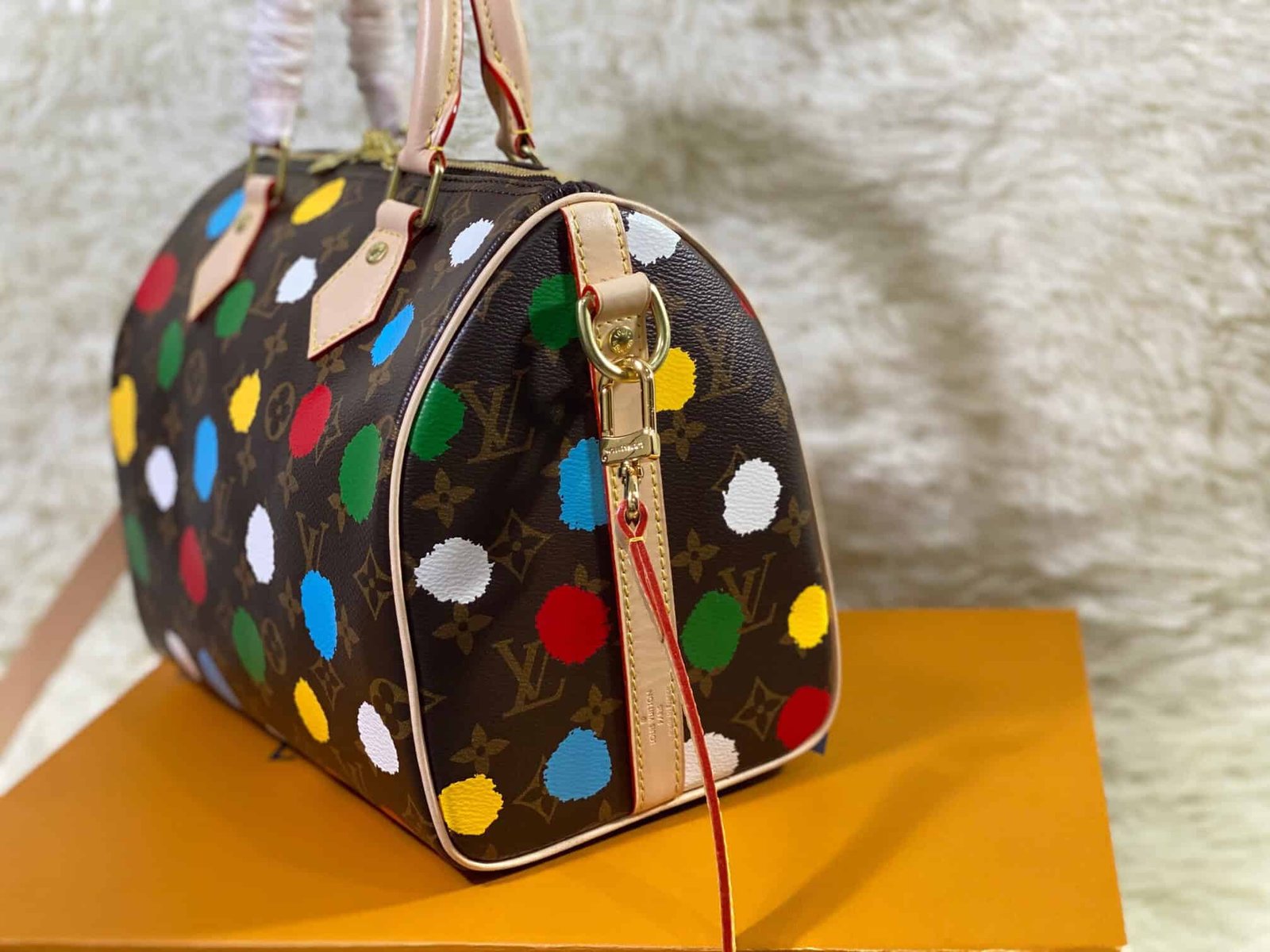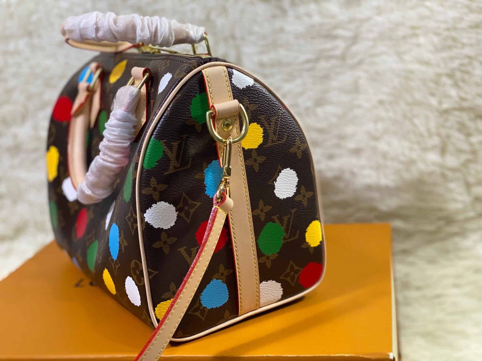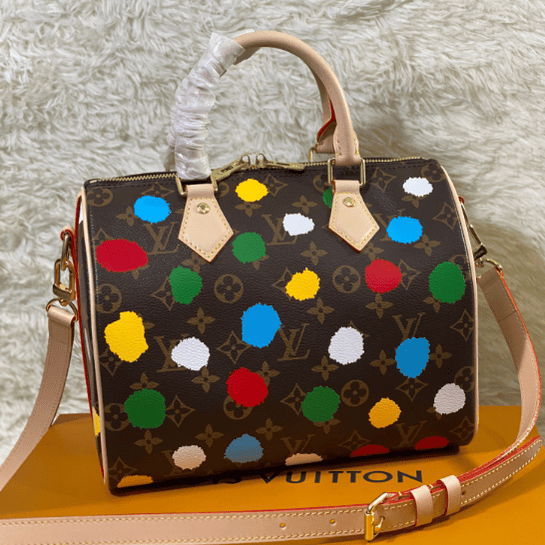 Spring/Summer New Products Presbyopia Polka Dot Print Speedy Bandoulière 25 handbags are made of metal texture coated canvas, presenting the eye-catching blooming of gorgeous buttercups, telling about the flowers that Nicolas Ghesquière cultivated for the 2022 Autumn/Winter fashion show theme. The classic silhouette enhances the romantic mood, and the rolled leather handle and detachable shoulder strap allow multiple carrying options.