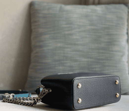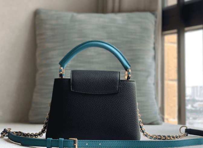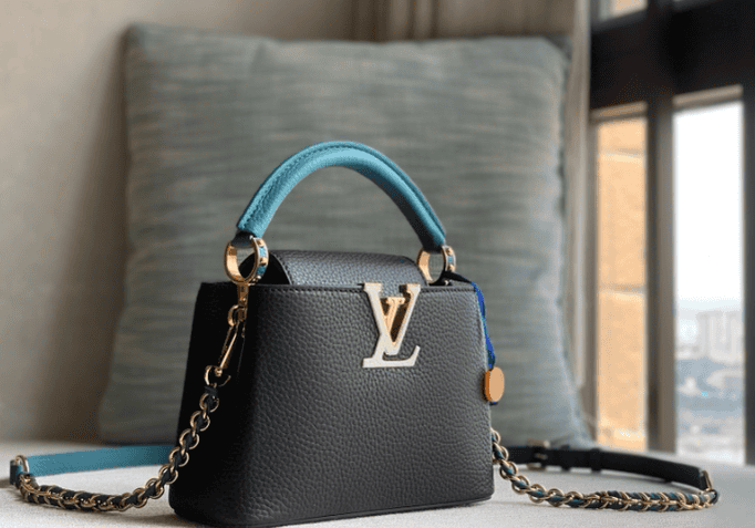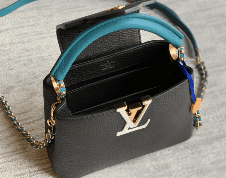 This Capucines BB handbag is made from Taurillon leather and features a wide colorful strap, with Louis Vuitton embroidered on one side and a graphic design of triangles and Monogram Flowers on the other. Named after a mountain range, the Karakoram pattern takes several hours to be embroidered on each strap.