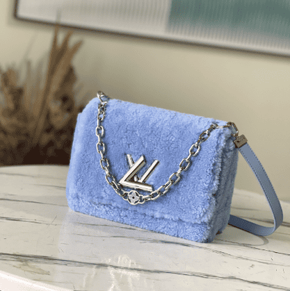 Blue plush TWIST medium handbag This Twist medium handbag focuses the eye in bright shearling leather, and then embellishes the double chain with enamel Monogram flowers. Both the chain and leather shoulder straps are detachable, so you can switch between a variety of carrying methods.
