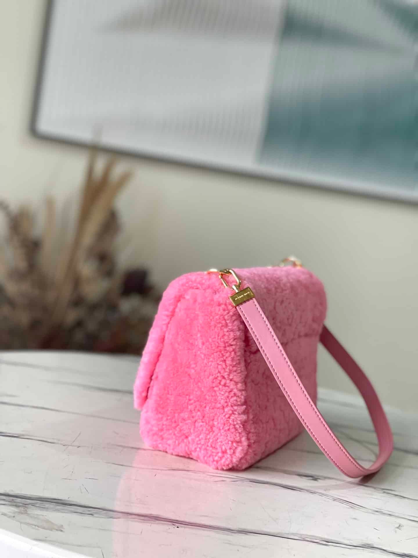 Pink plush TWIST medium handbag This Twist medium handbag focuses the eye in bright wool leather, and then embellishes the double chain with enamel Monogram flowers. Both the chain and leather shoulder straps are detachable, so you can switch between a variety of carrying methods.