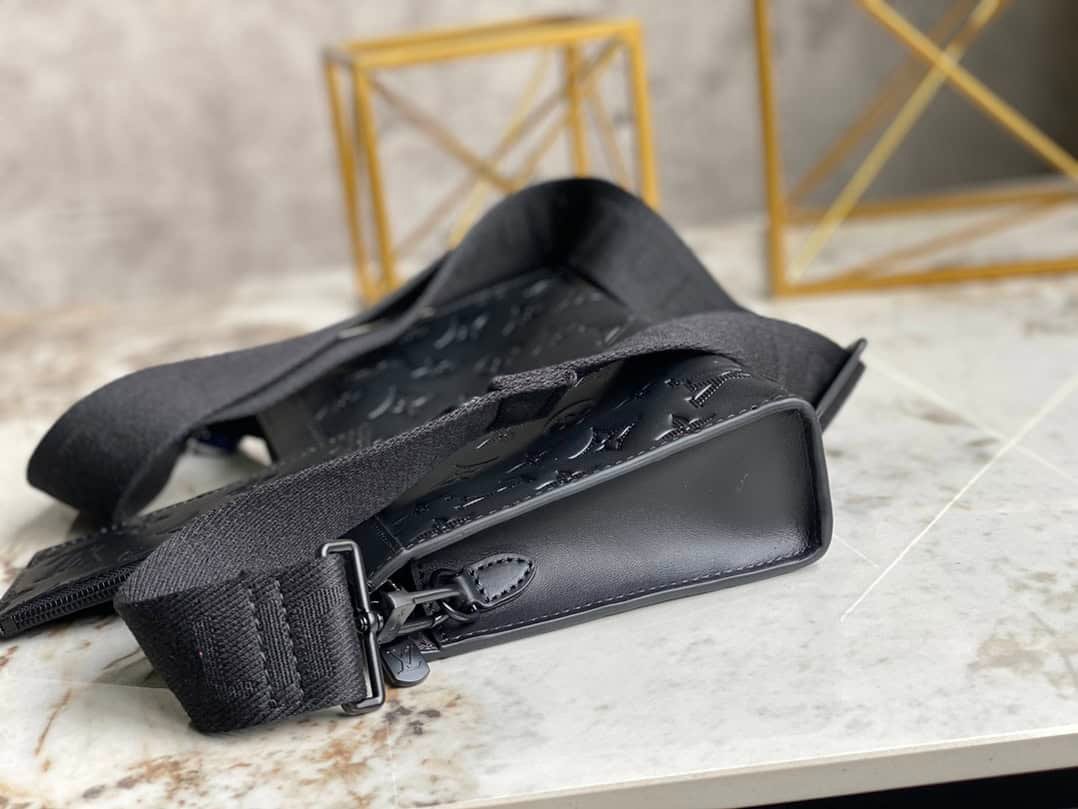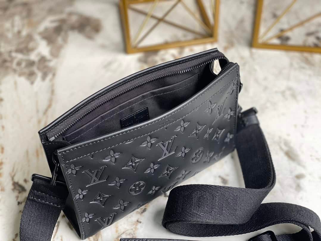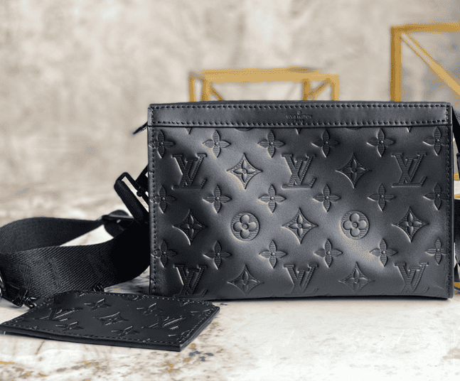 Black full leather two-piece men’s bag series Alpha Wearable Wallet combines Monogram Eclipse canvas and leather trim, which can accommodate mobile phones and small wallets. The wide-mouth design and side bellows provide easy access, and the adjustable shoulder strap allows for a variety of carrying options.