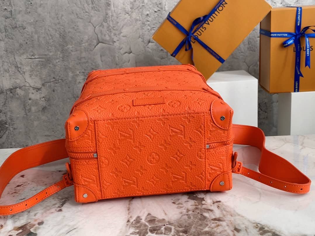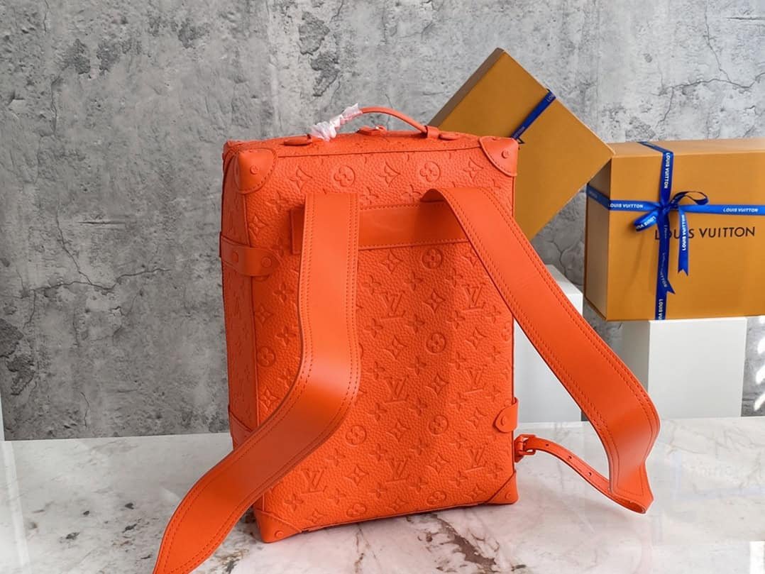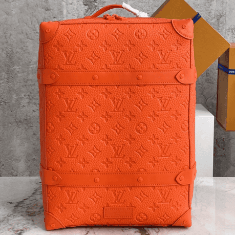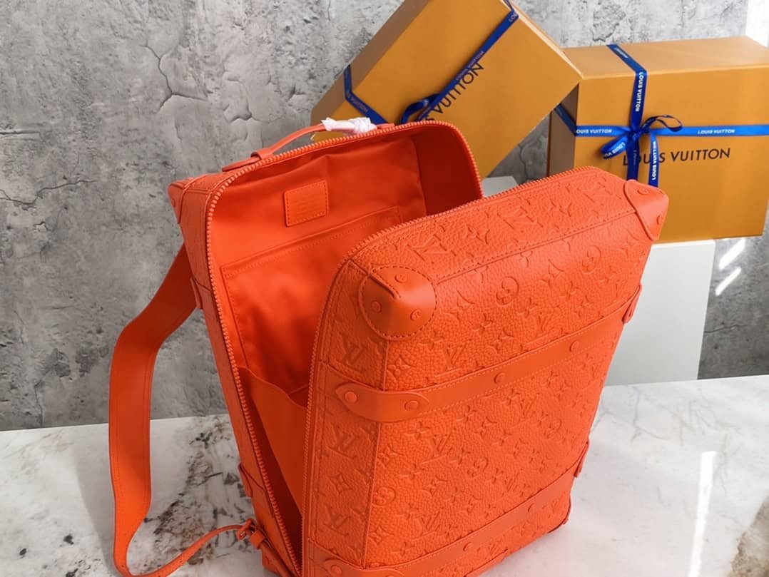 Orange Full Leather Backpack Series Men’s Art Director Virgil Abloh gives the suitcase configuration a backpack function, using Monogram coated canvas and cowhide trim to create this Soft Trunk small backpack, stitched Rivet corners. There is also a top handle for a portable experience. Monogram coated canvas-fabric lining-cowhide trim-copper gold-tone hardware-adjustable leather shoulder strap-leather top handle-pair of inner pockets-inner patch pocket.