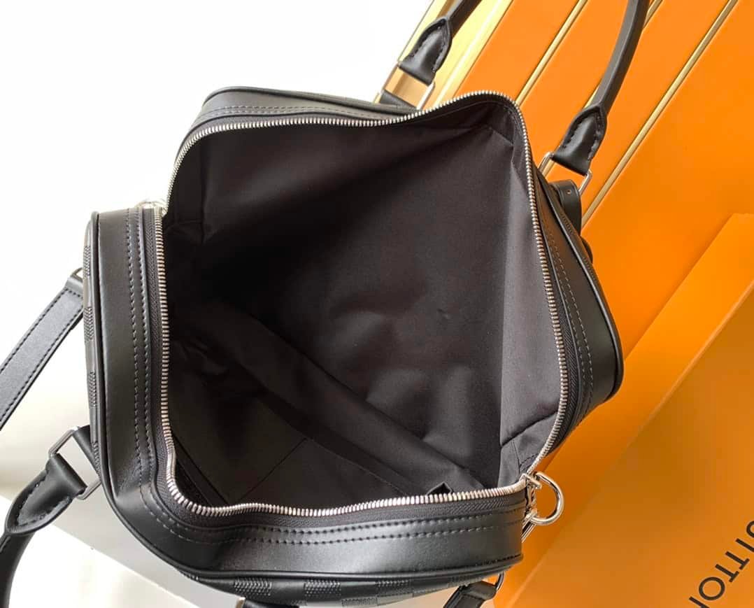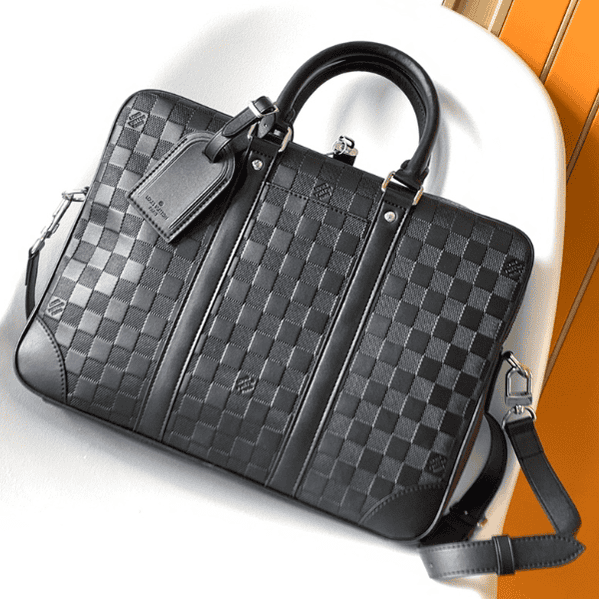 This Voyage small briefcase is made of Damier Graphite coated canvas, with leather side straps, reinforced corners, top handles and nameplates. An exterior pocket is convenient for smartphone storage, a padded interior compartment can hold a 13-inch laptop, and the detachable and adjustable shoulder strap provides comfortable shoulder carry.