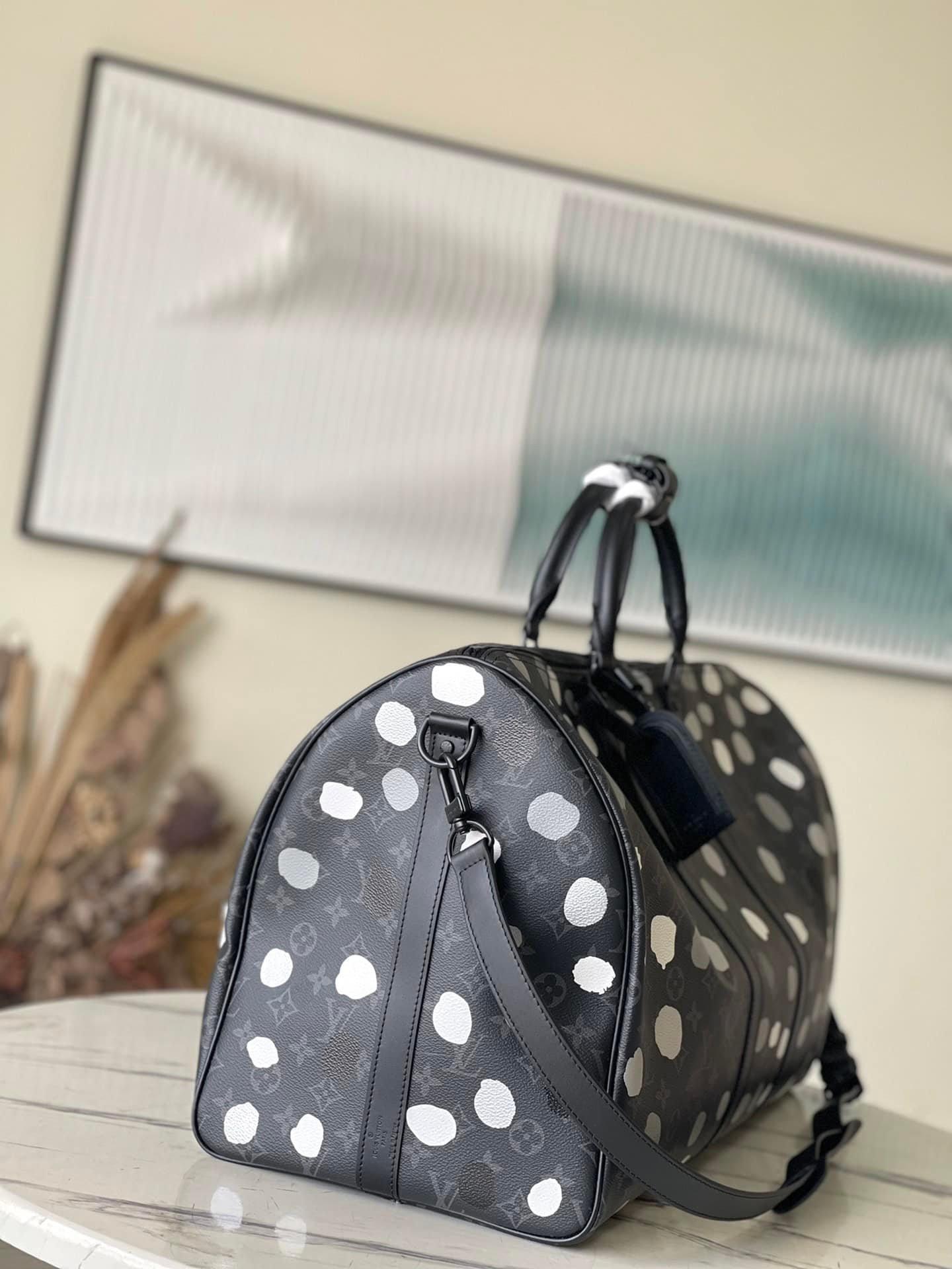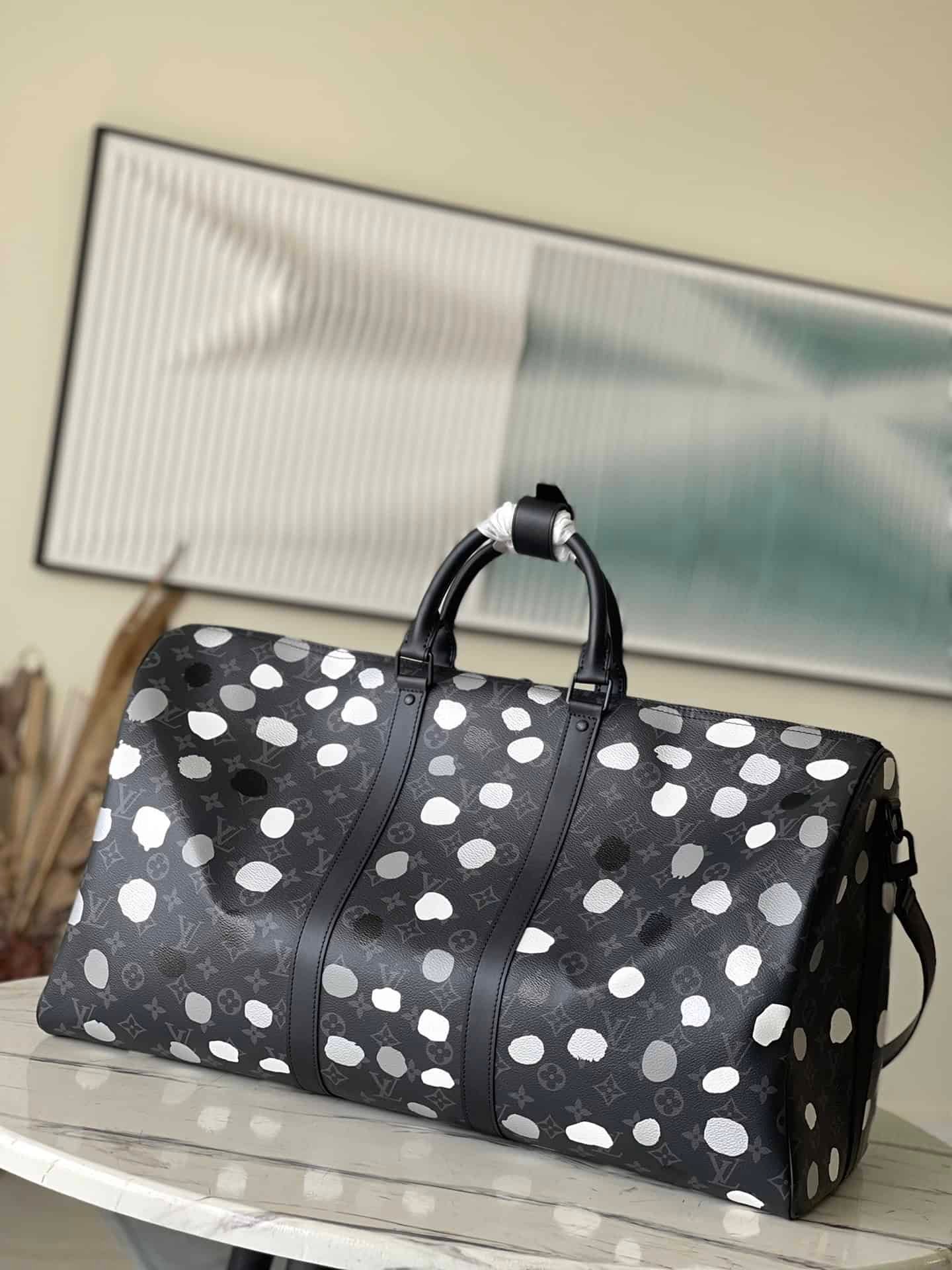 YK Keepall 55 travel bags are from the x Yayoi Kusama collaboration series. The polka-dot pattern is depicted on the Monogram Eclipse canvas, praising the fusion of artistic creativity and exquisite craftsmanship, and once again becoming a good collection. Japanese artist Yayoi Kusama’s fascination with polka dots began in childhood, and she runs through her personal works as a concrete expression of disorder.