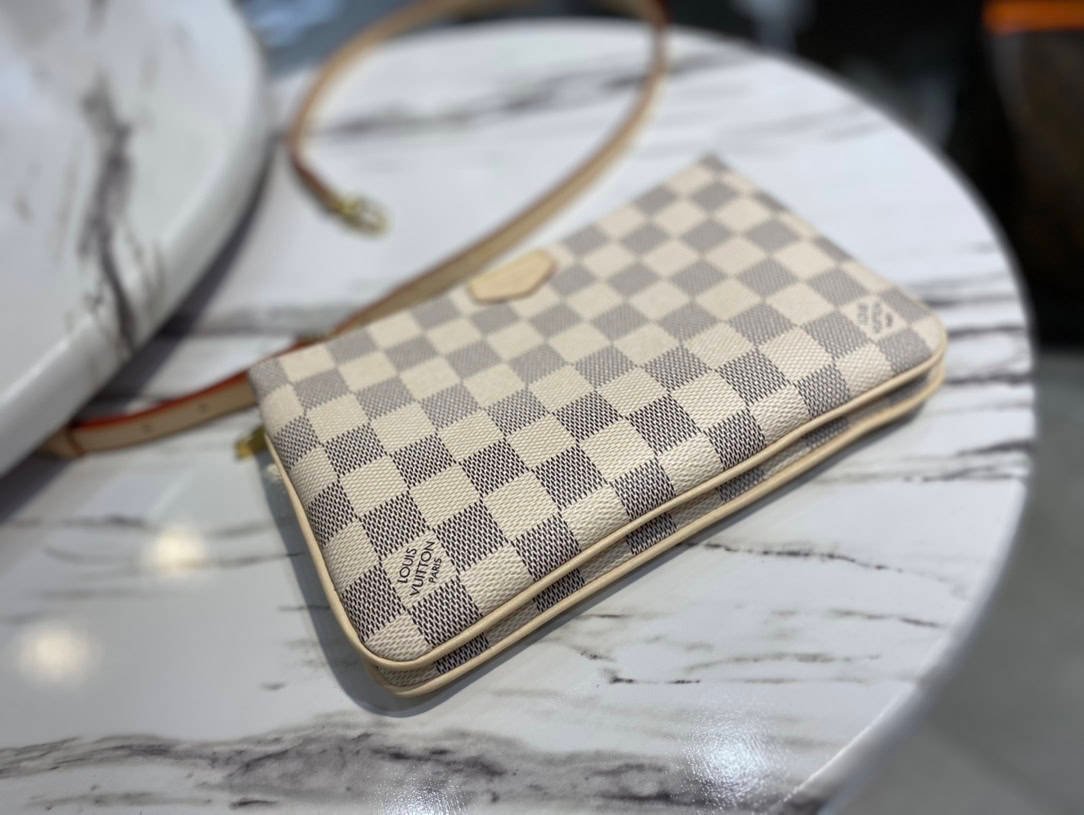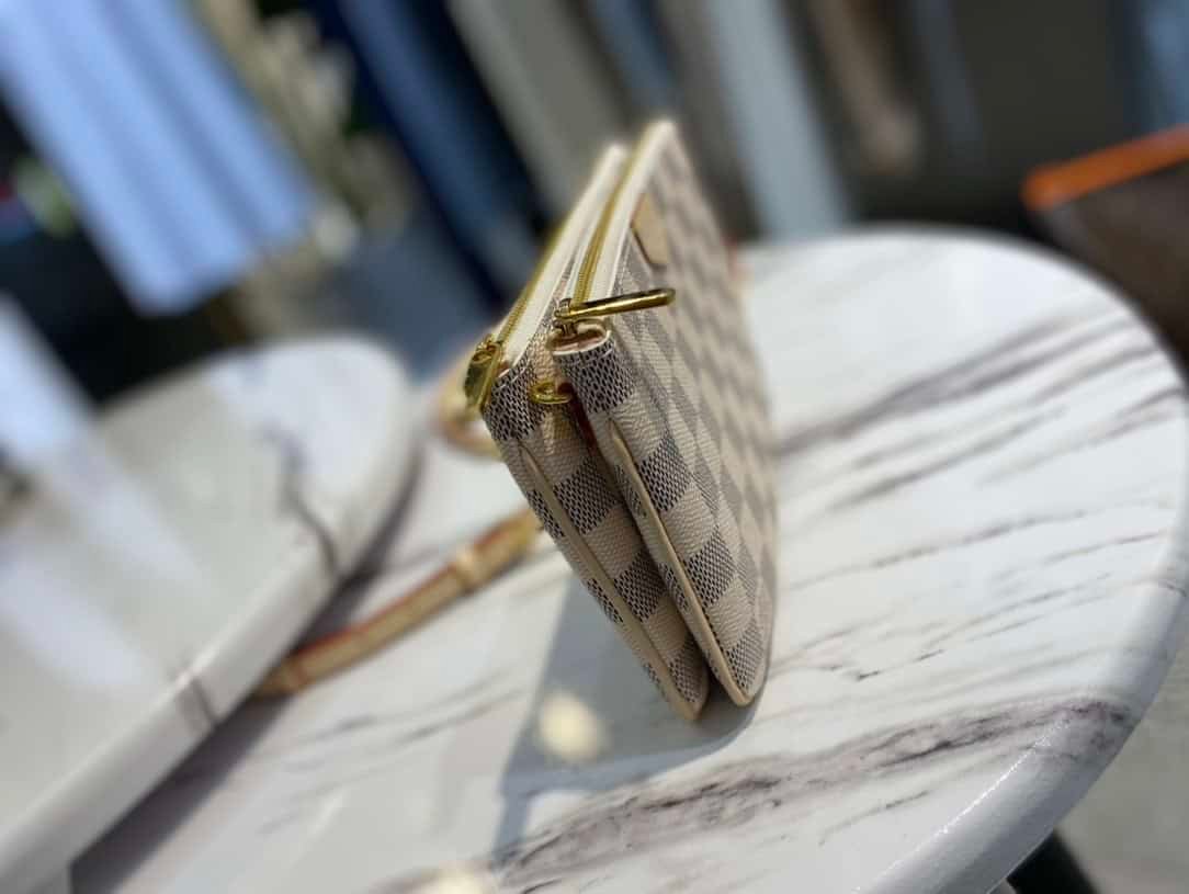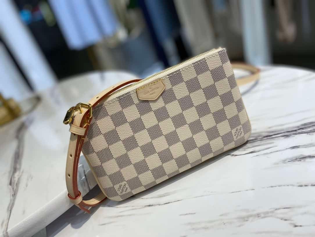 Double Zip Pochette handbag is made of Damier Azur canvas, with a detachable shoulder strap cut from Louis Vuitton’s classic natural cowhide. There is an open pocket in the center of the zipper bag, and the natural leather label is embossed with the brand logo.