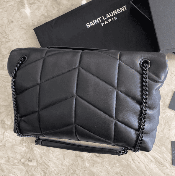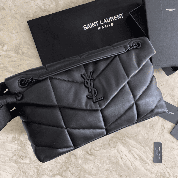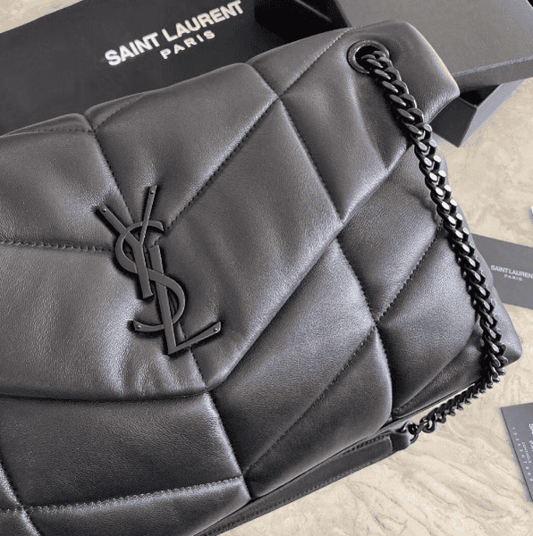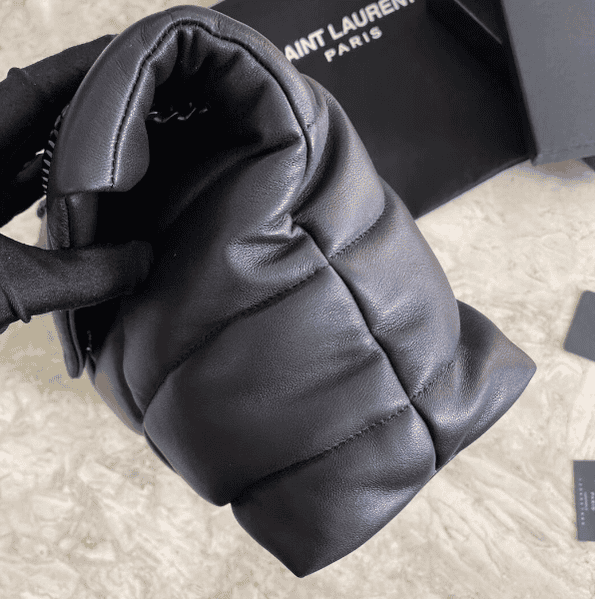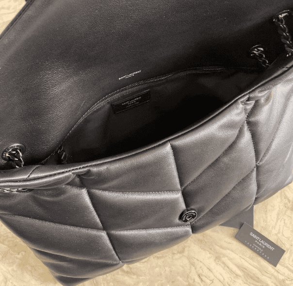 Saint Laurent Paris Saint Laurent new style bi-fold back shoulder quilted lambskin bag brushed metal trim grosgrain lining, magnetic four-button closure one zipper inner pocket.