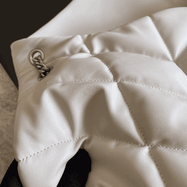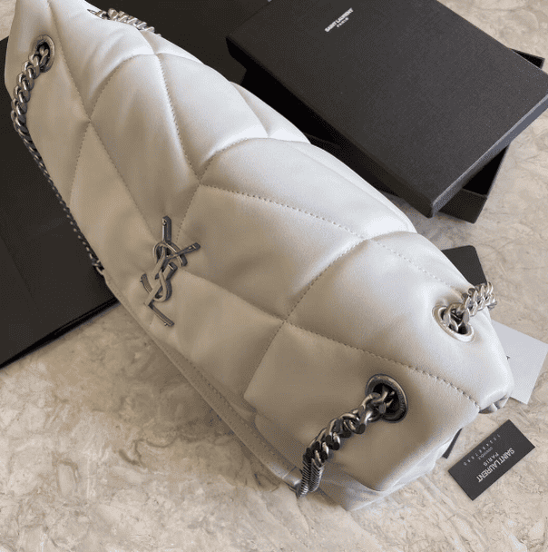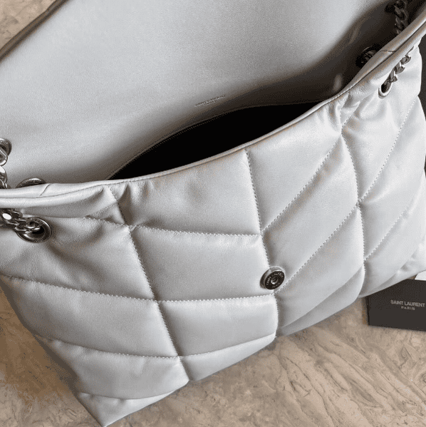 Saint Laurent Paris Saint Laurent new style bi-fold back shoulder quilted lambskin bag brushed metal trim grosgrain lining, magnetic four-button closure one zipper inner pocket.