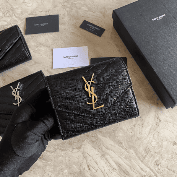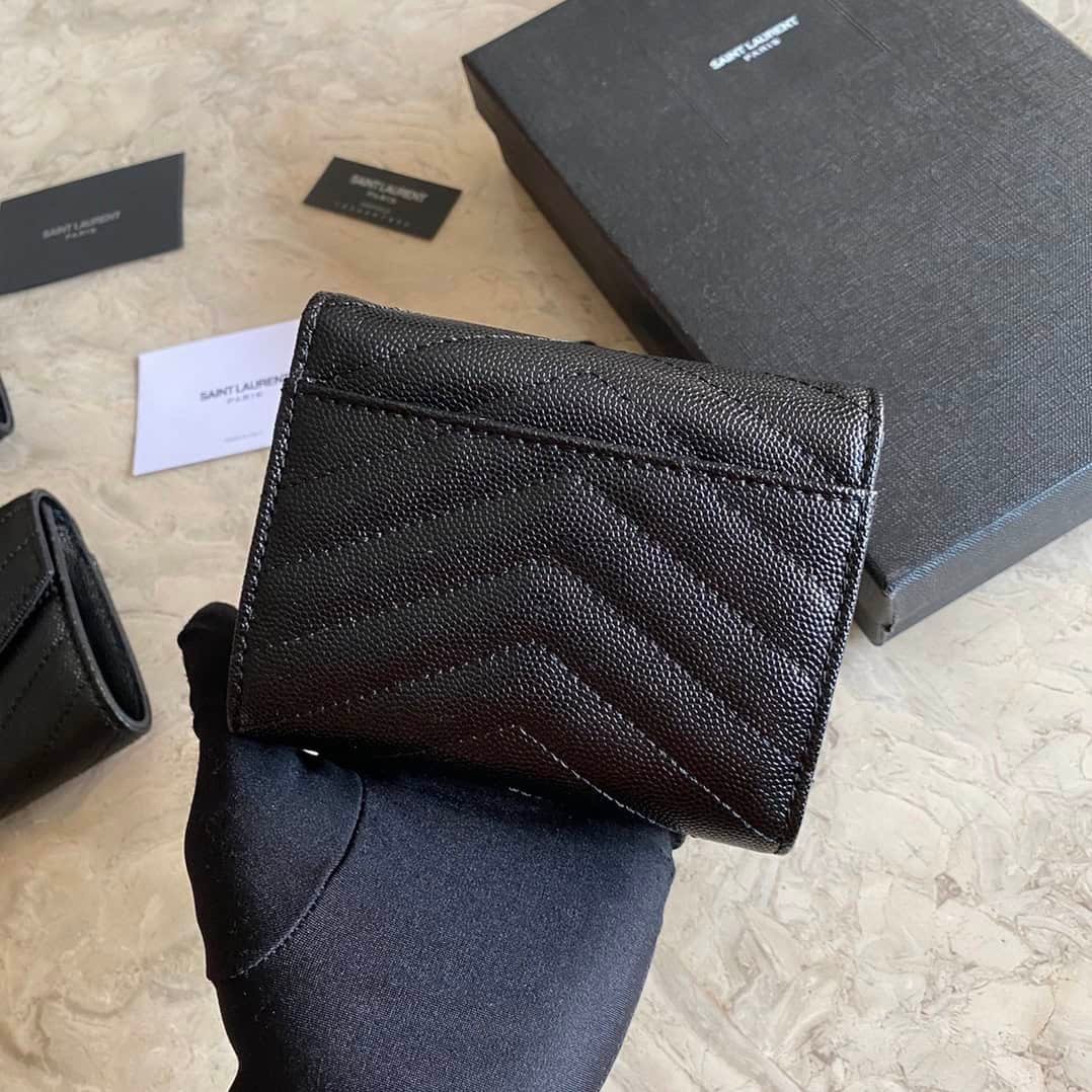 Yves Saint Laurent YSL Caviar Short Tri-fold Wallet Six card slots and a coin pocket One banknote compartment and four receipt compartments.