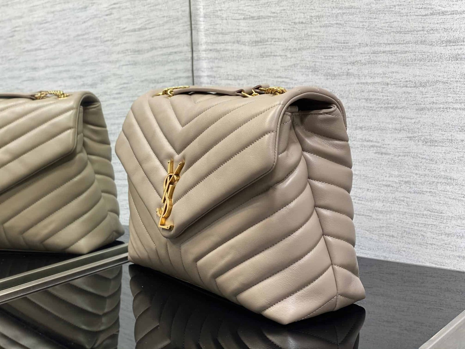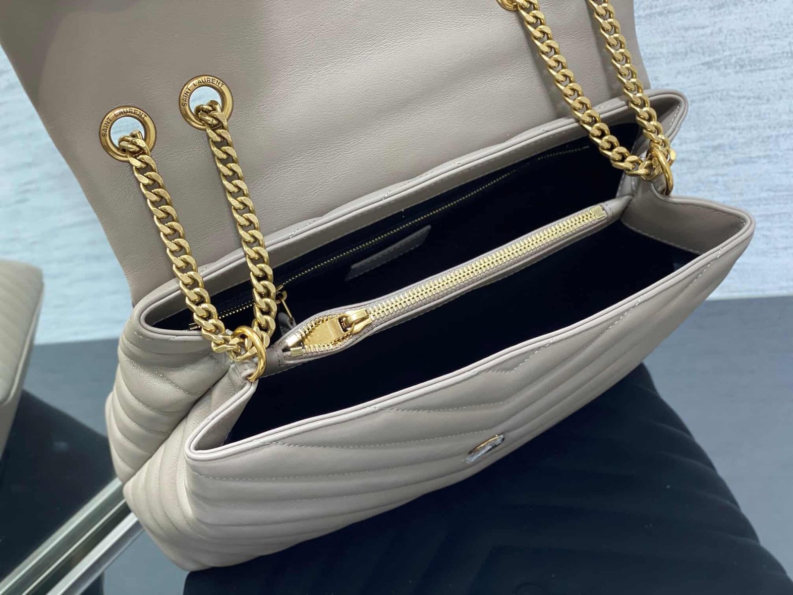 YSL Large Long Envelope Satchel Classic Soft Shape Front Flap Bag Strap Metal Interlocking YSL Logo Metal and Leather Chain Shoulder Strap with Y-Shaped Stitching